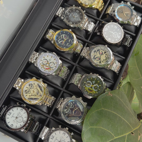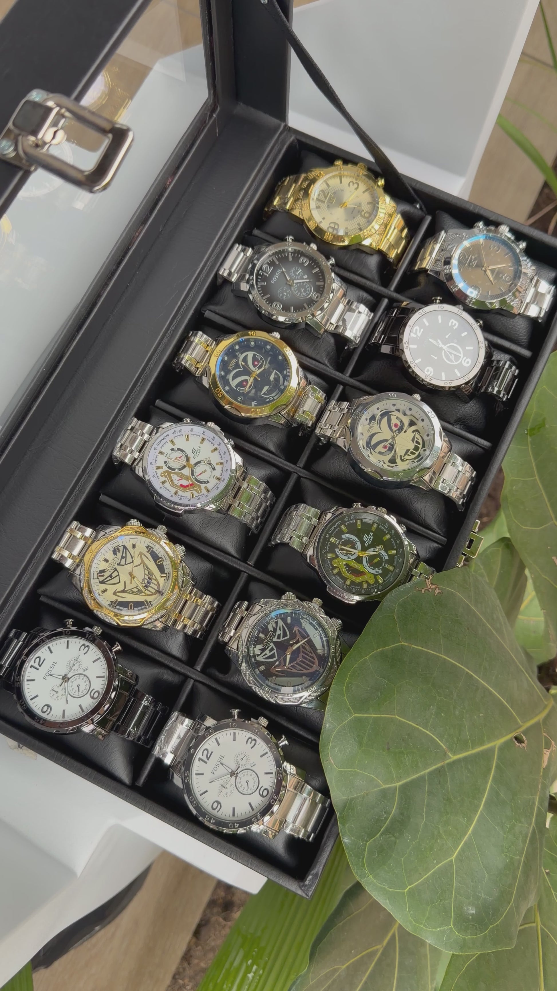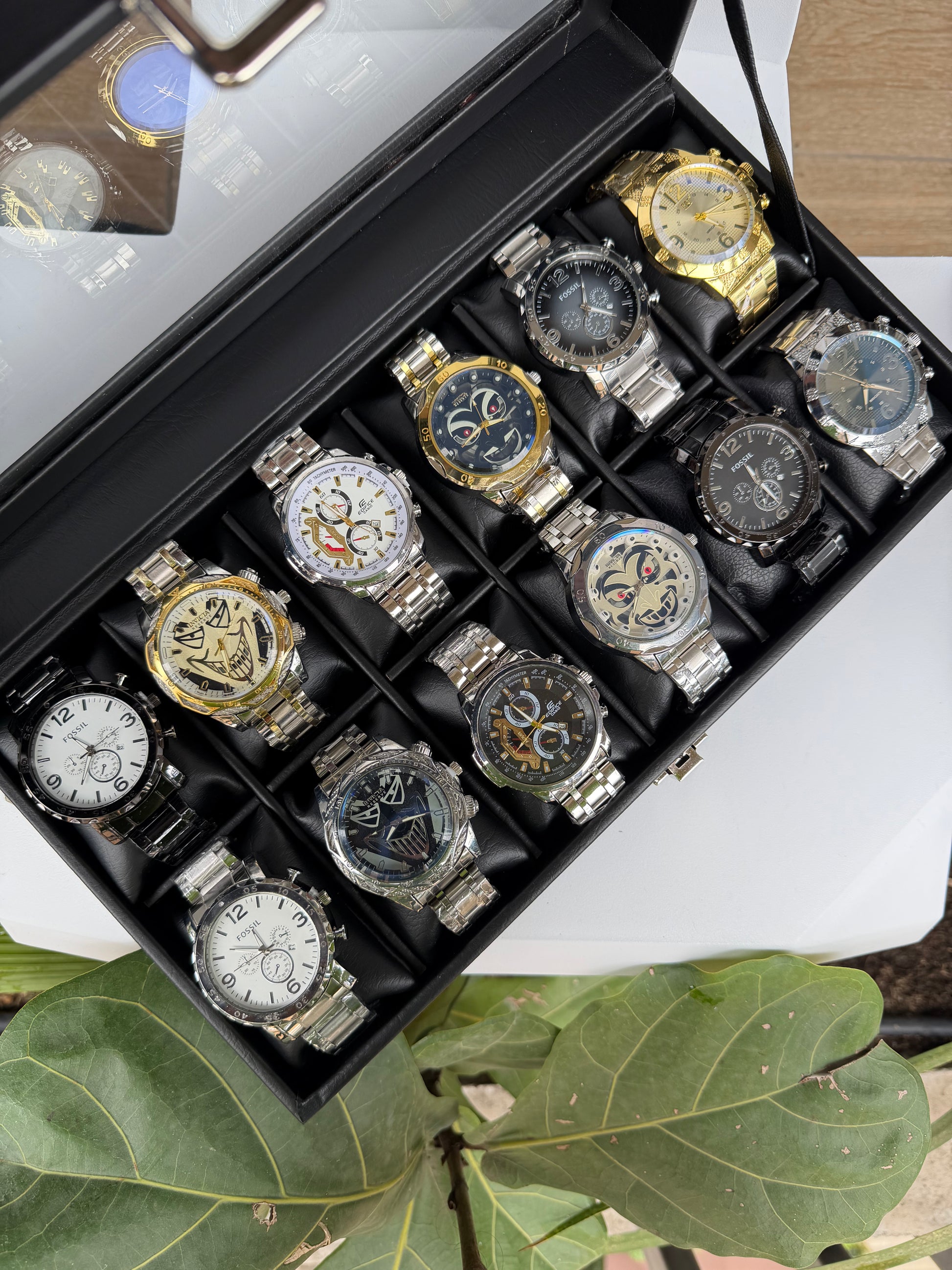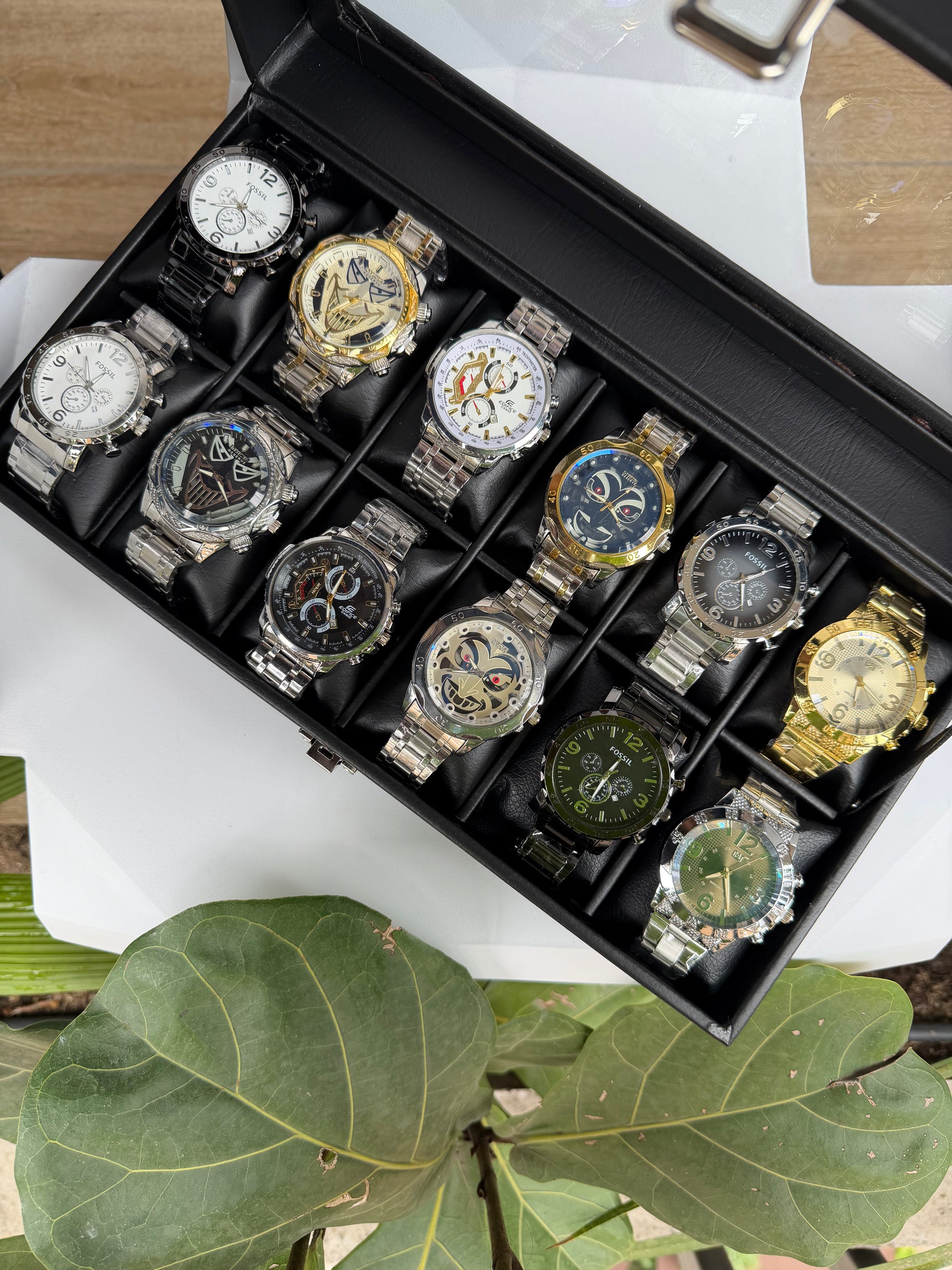 Relojeras se venden a parte (la categoría se llama relojeras y ahí están todas las disponibles para añadir a tu compra según la cantidad de relojes en el combo)