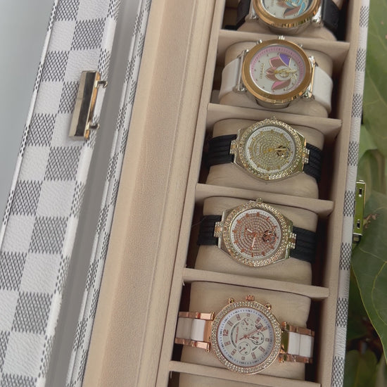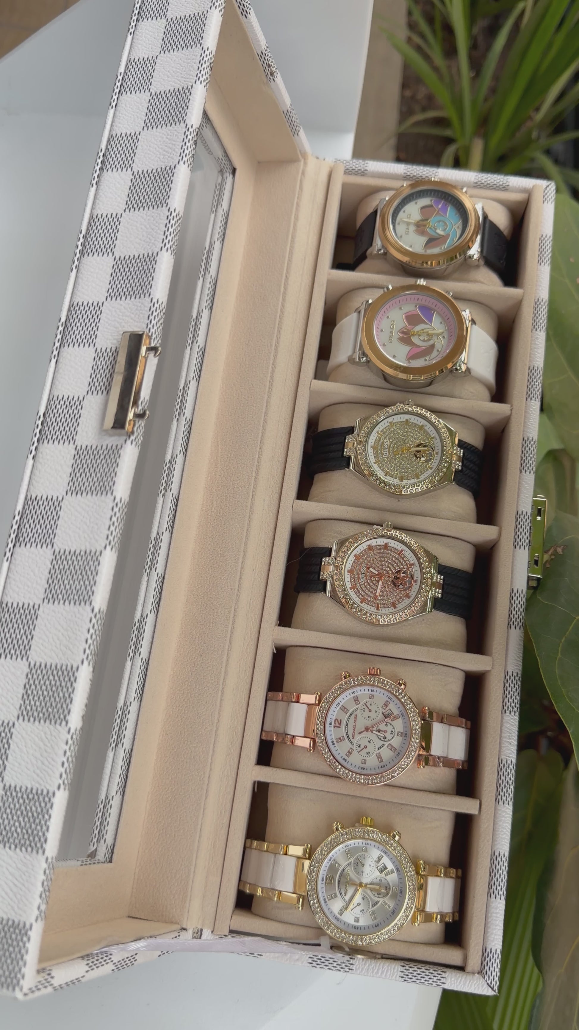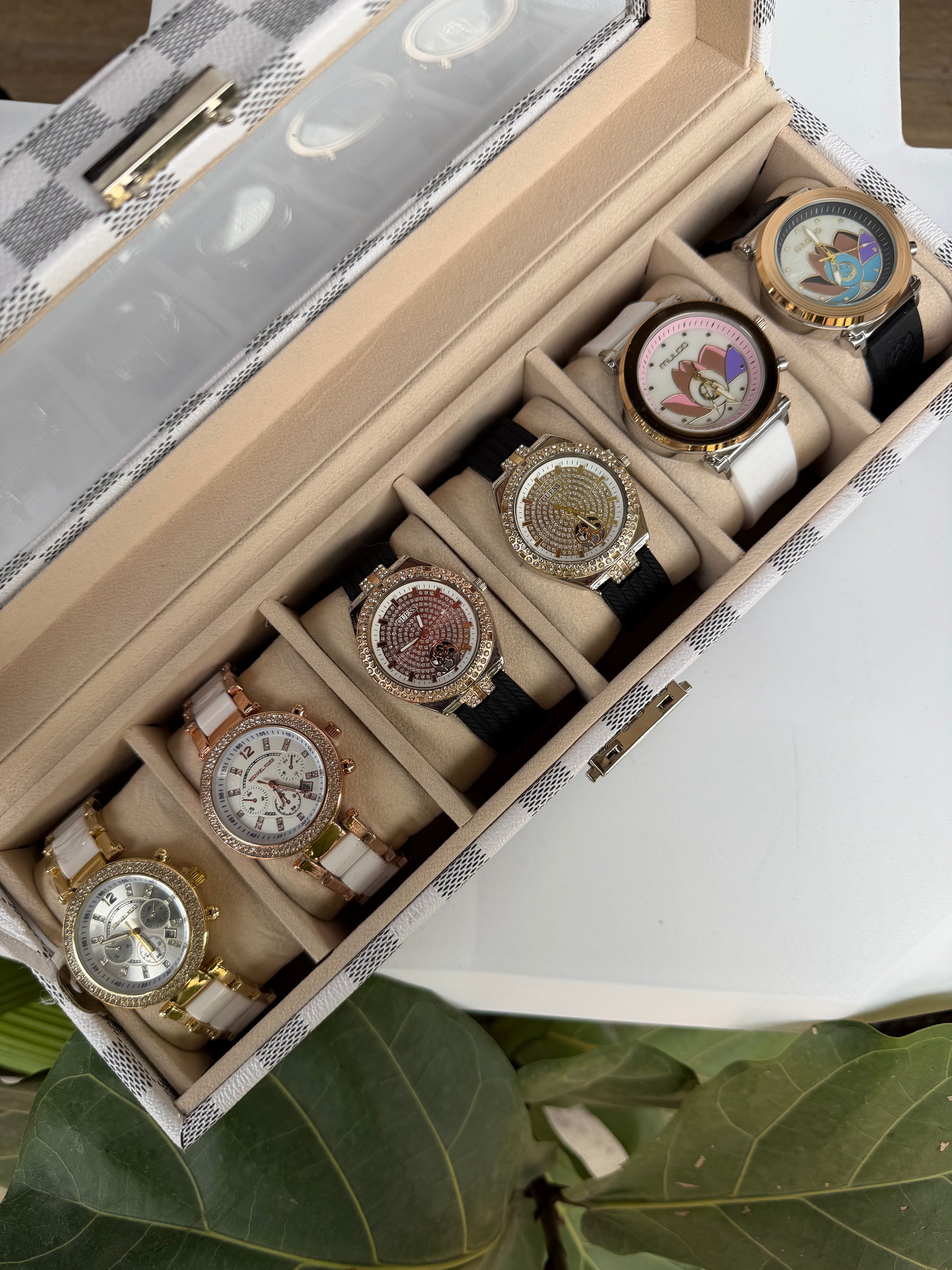 Relojeras se venden a parte (la categoría se llama relojeras y ahí están todas las disponibles para añadir a tu compra según la cantidad de relojes en el combo)