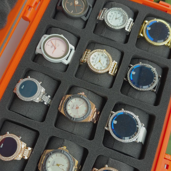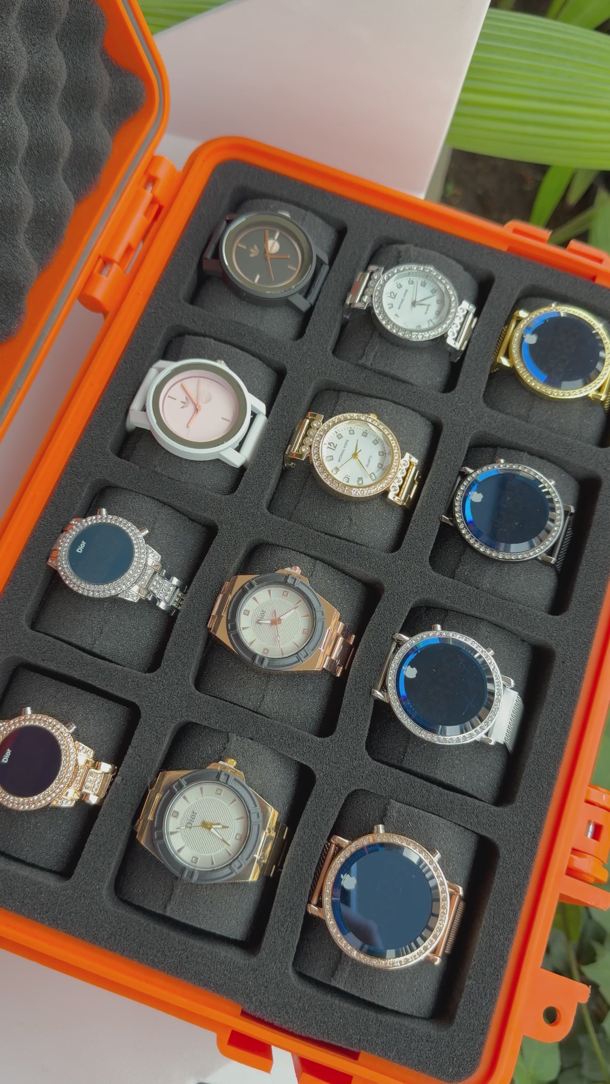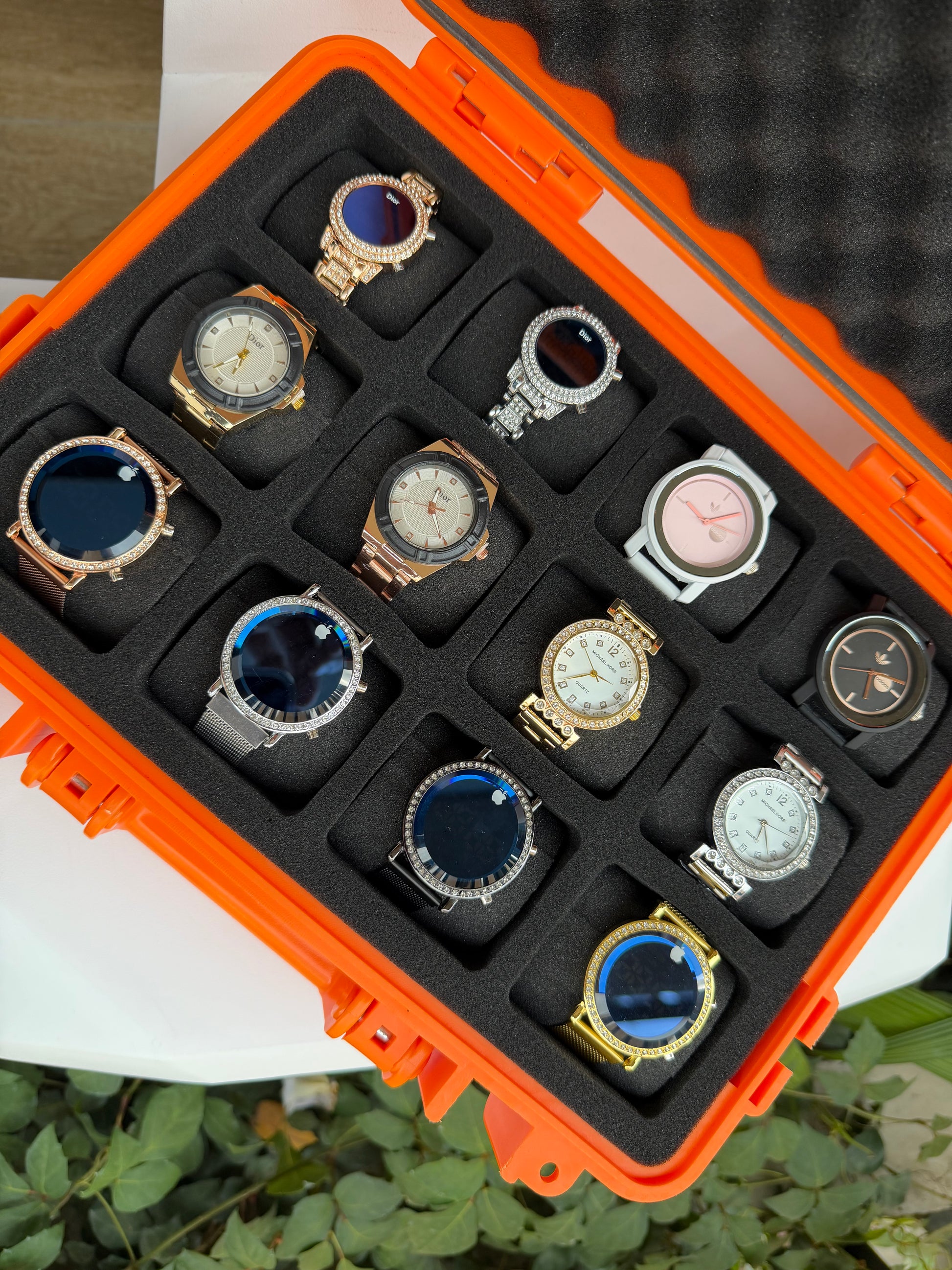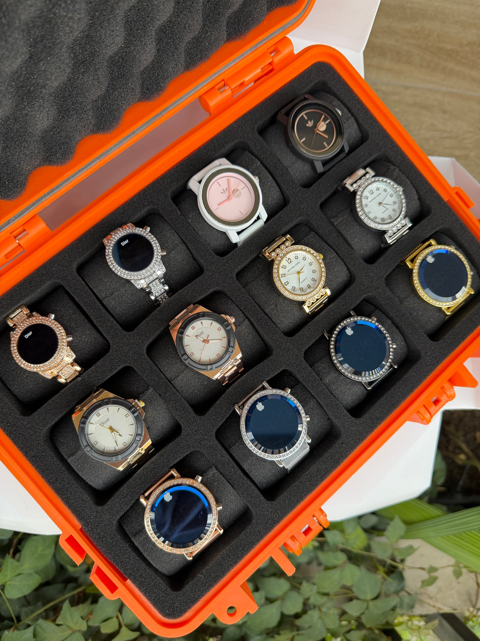 Relojeras se venden a parte (la categoría se llama relojeras y ahí están todas las disponibles para añadir a tu compra según la cantidad de relojes en el combo)