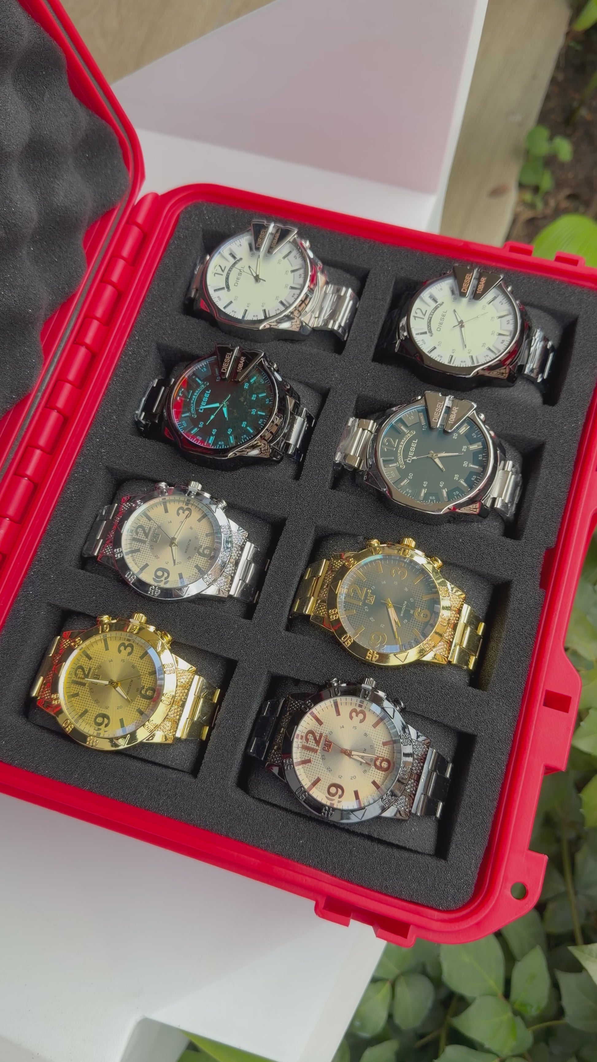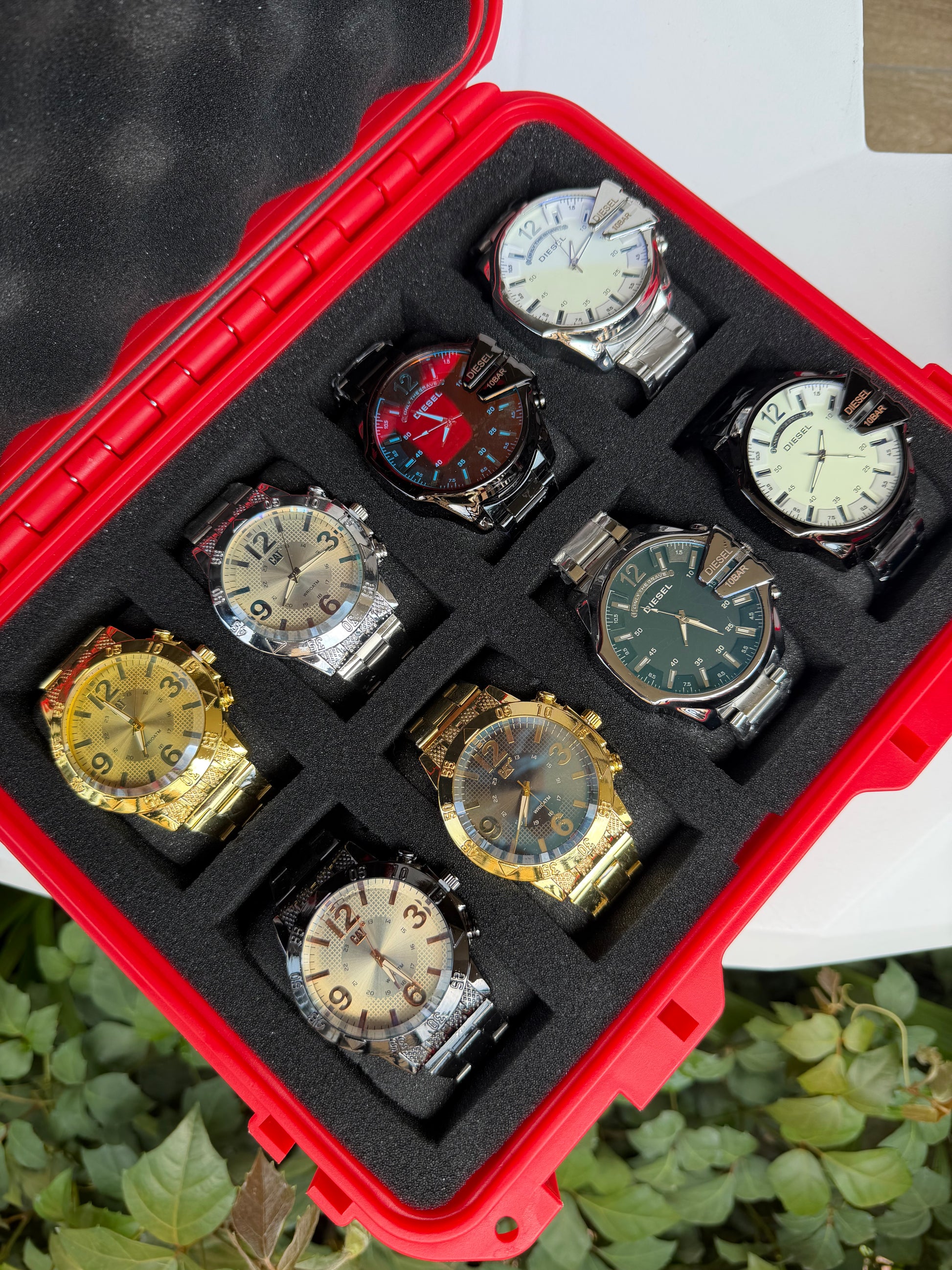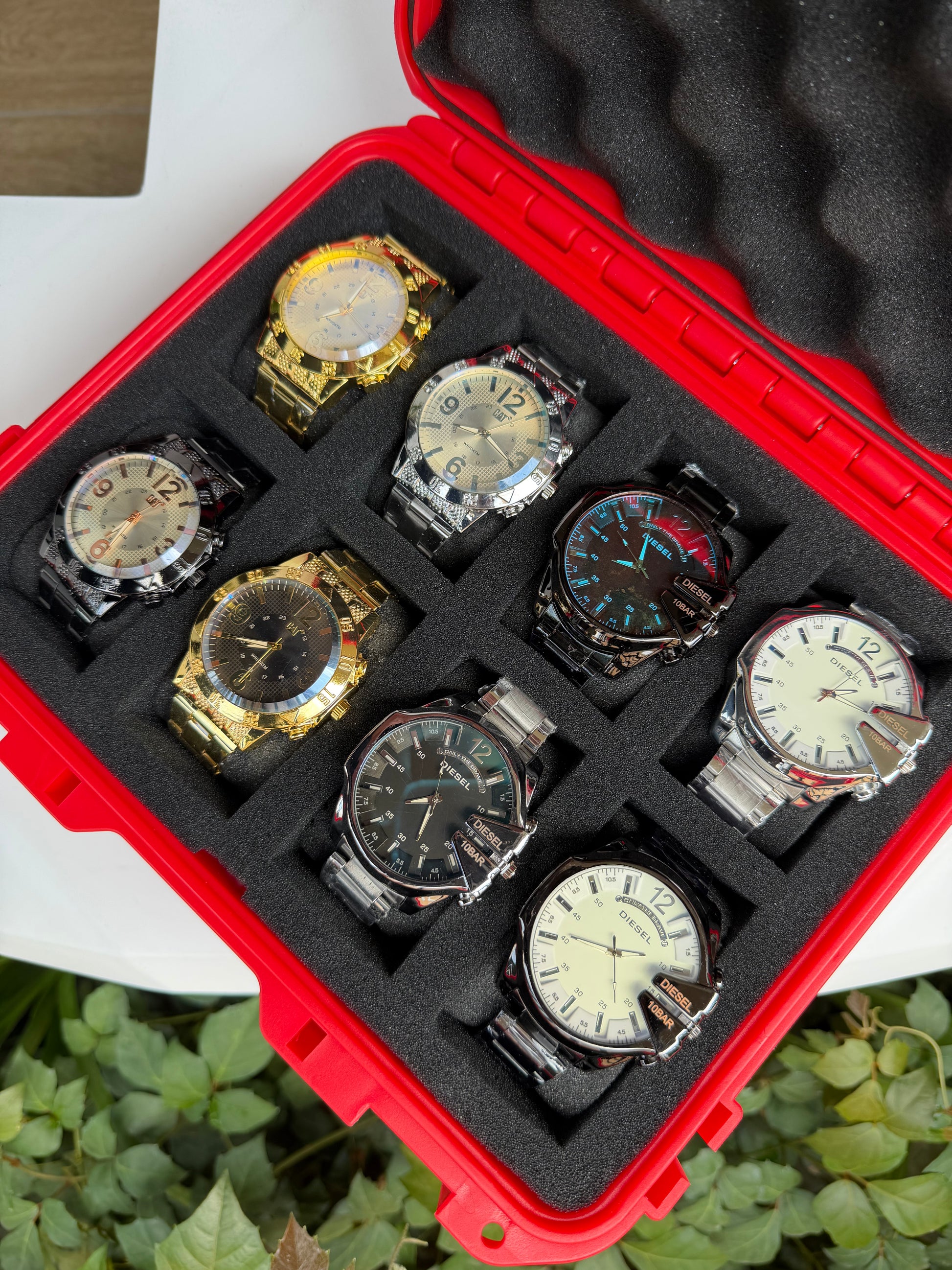 Relojeras se venden a parte (la categoría se llama relojeras y ahí están todas las disponibles para añadir a tu compra según la cantidad de relojes en el combo)