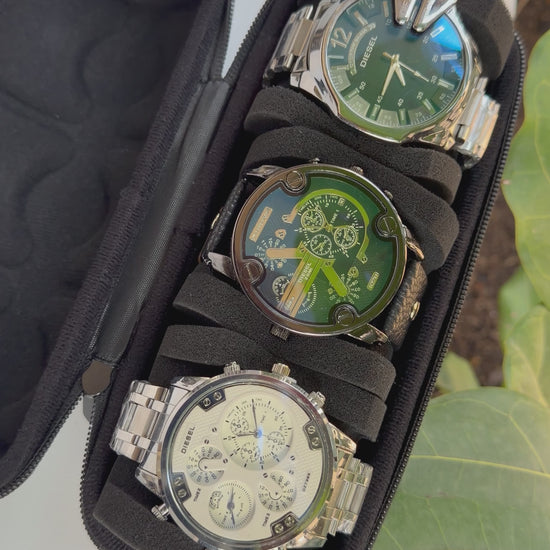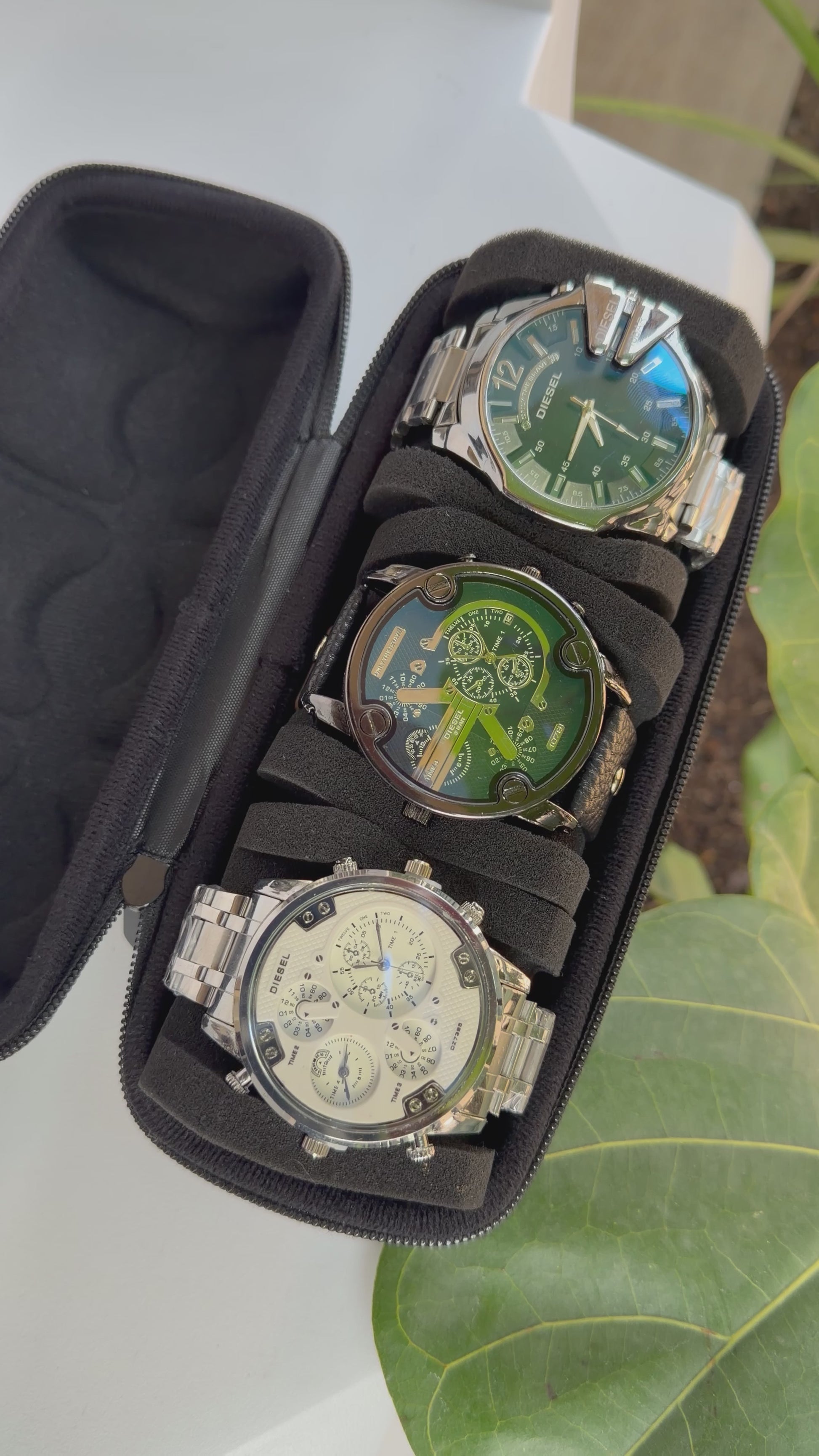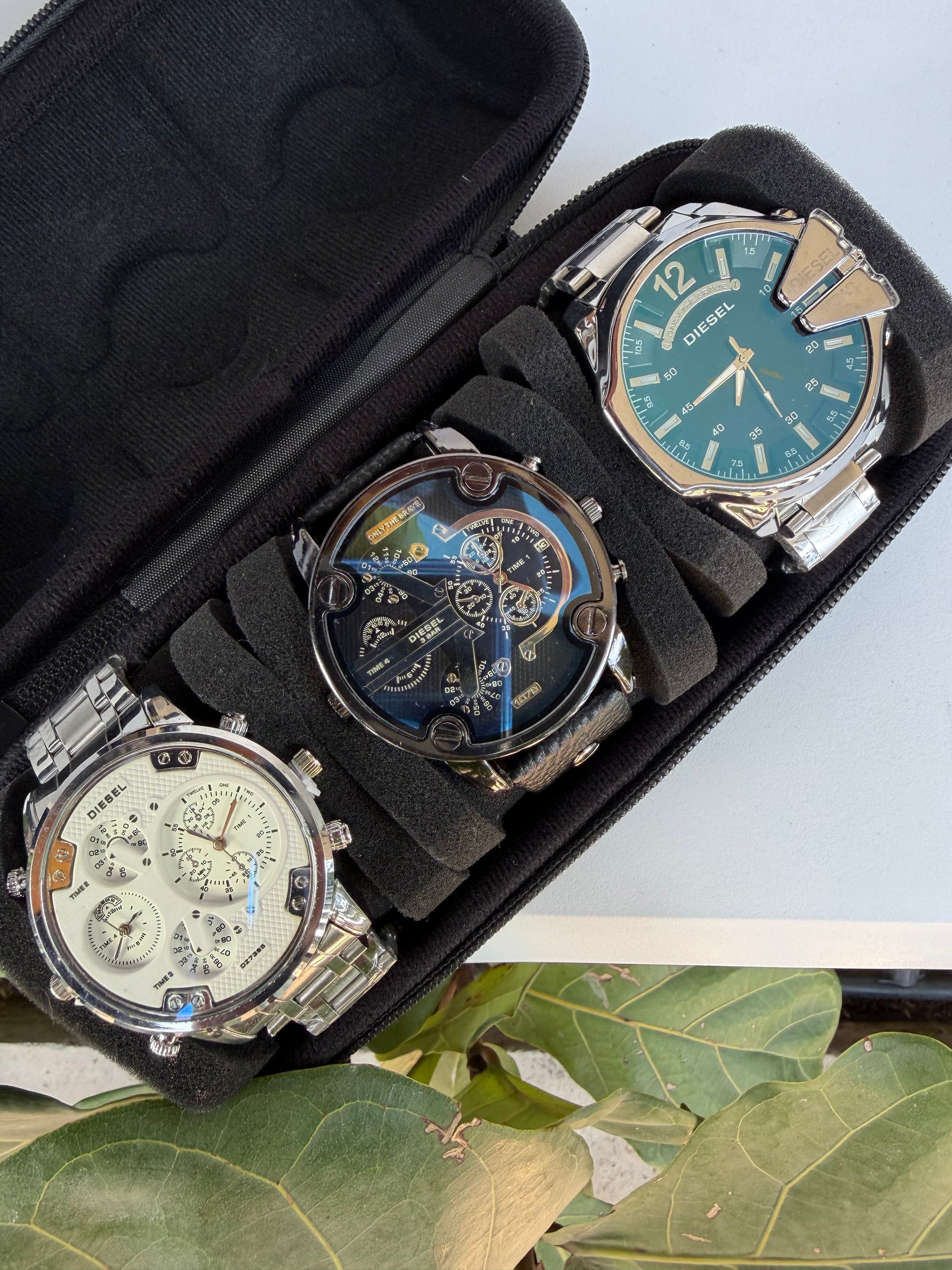 Relojeras se venden a parte (la categoría se llama relojeras y ahí están todas las disponibles para añadir a tu compra según la cantidad de relojes en el combo)