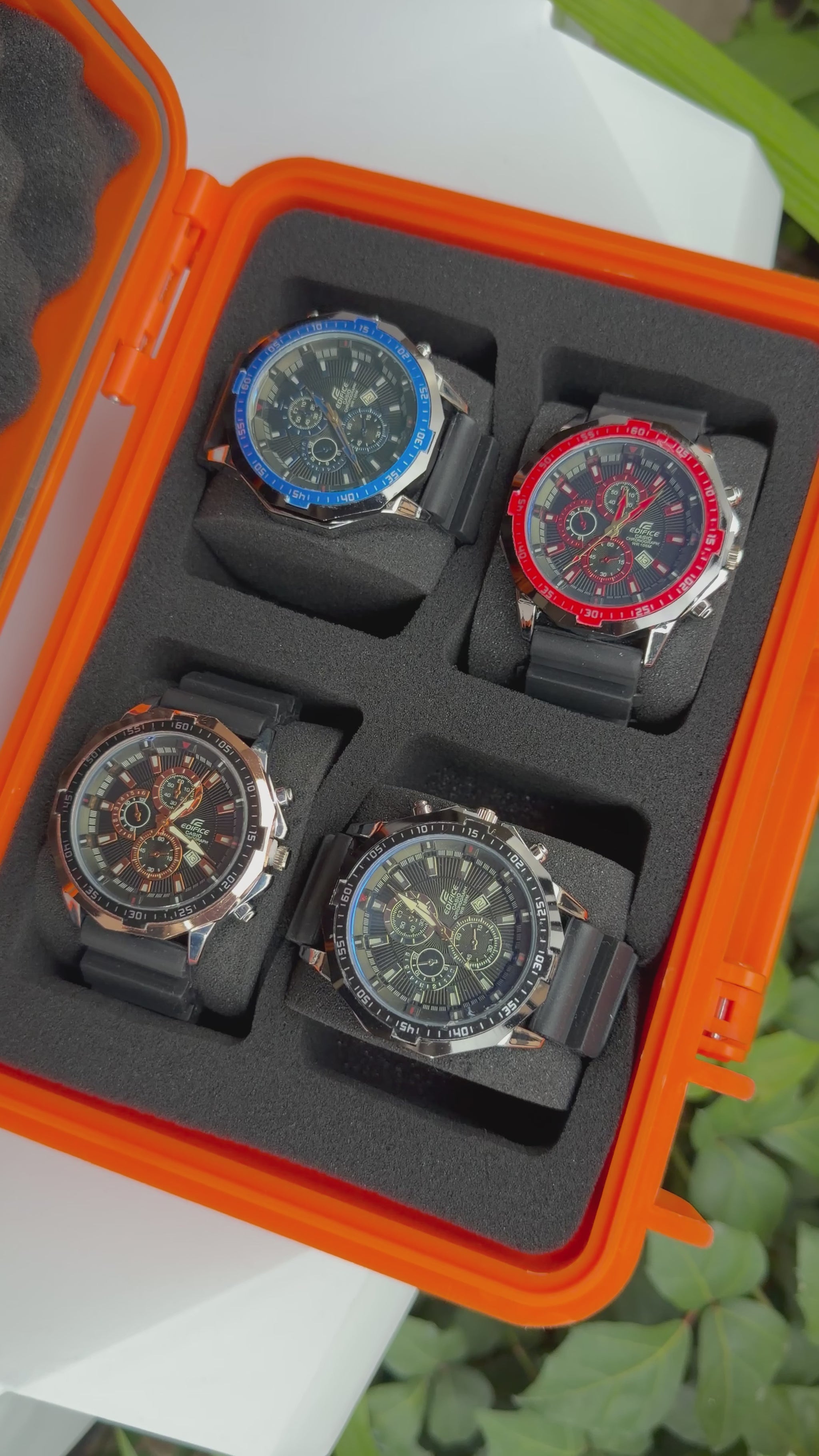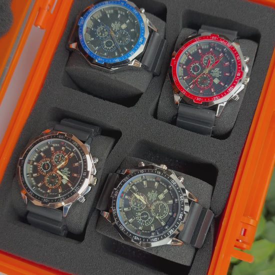 Relojeras se venden a parte (la categoría se llama relojeras y ahí están todas las disponibles para añadir a tu compra según la cantidad de relojes en el combo)