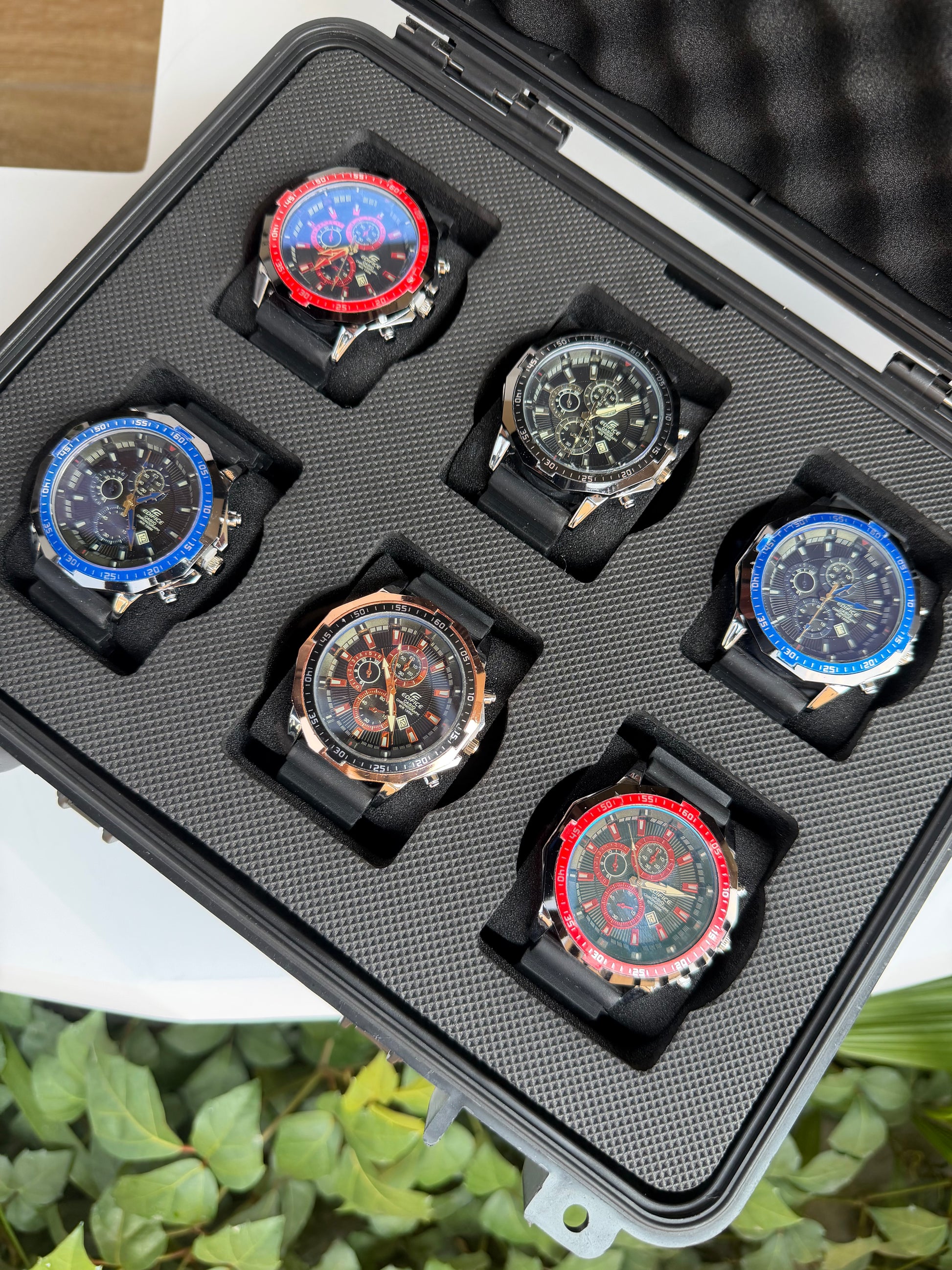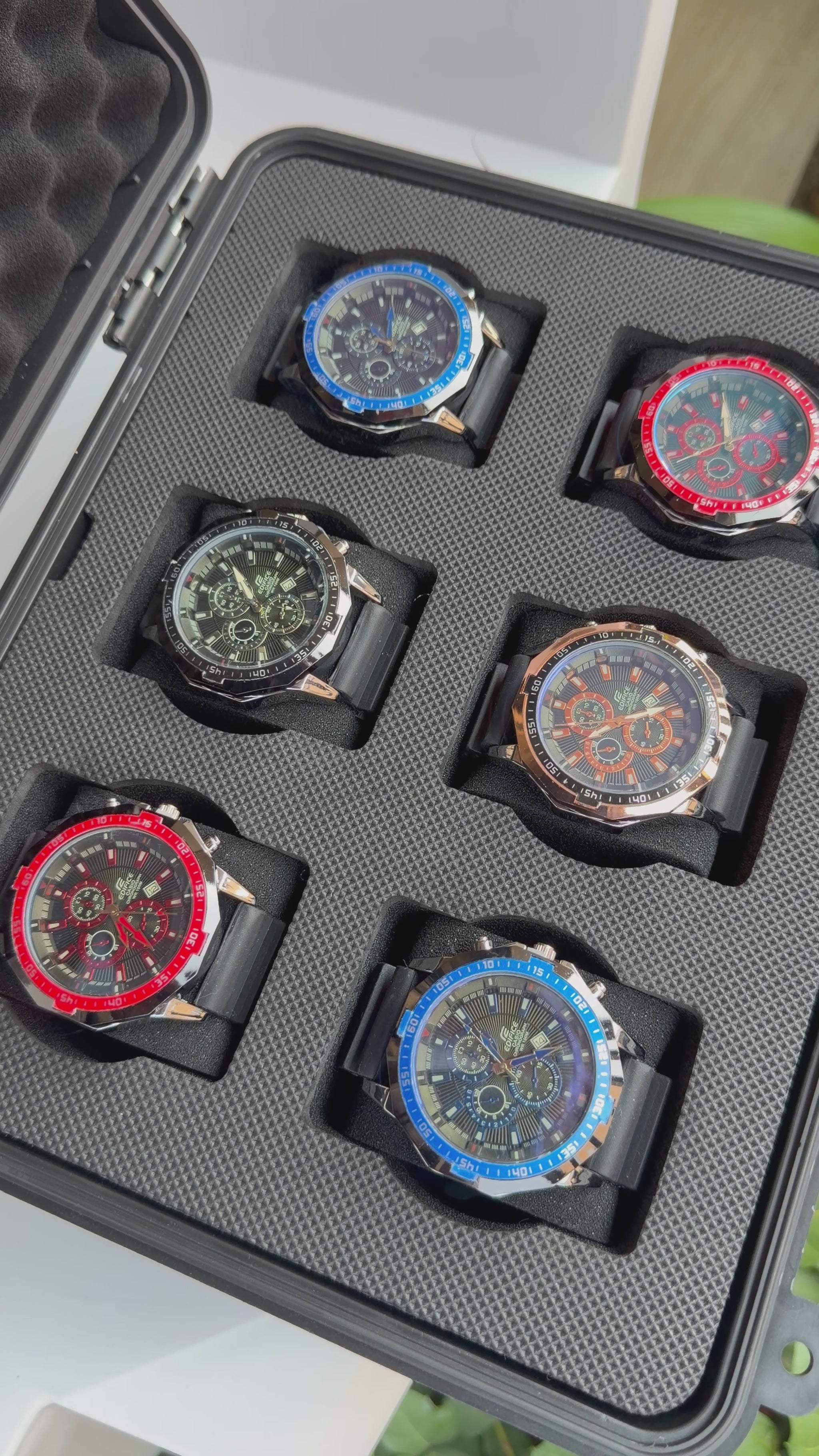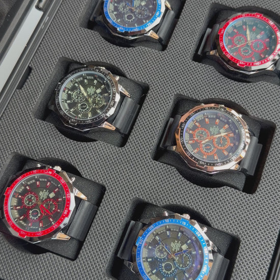 Relojeras se venden a parte (la categoría se llama relojeras y ahí están todas las disponibles para añadir a tu compra según la cantidad de relojes en el combo)