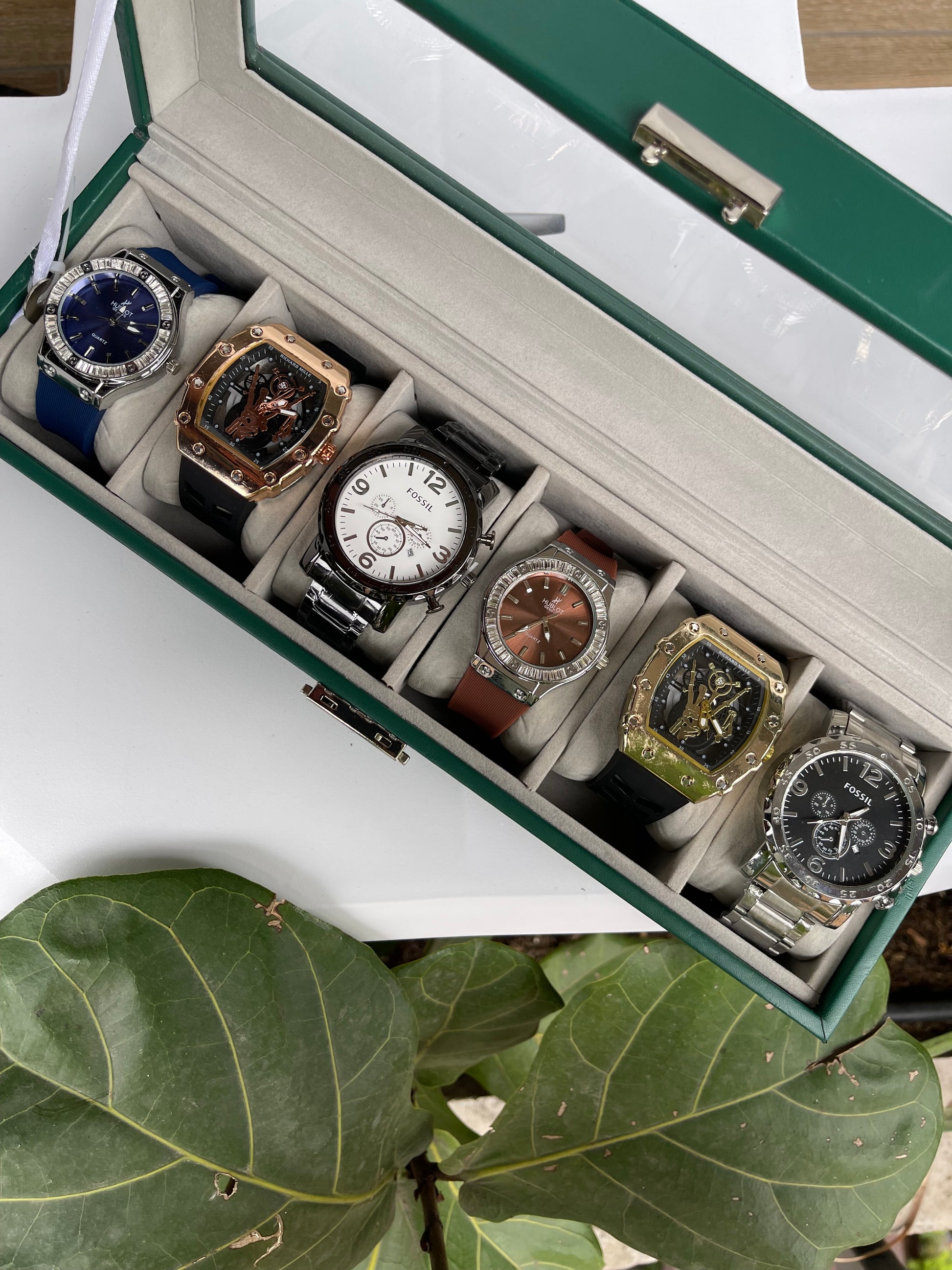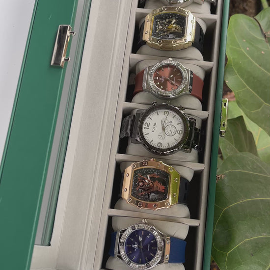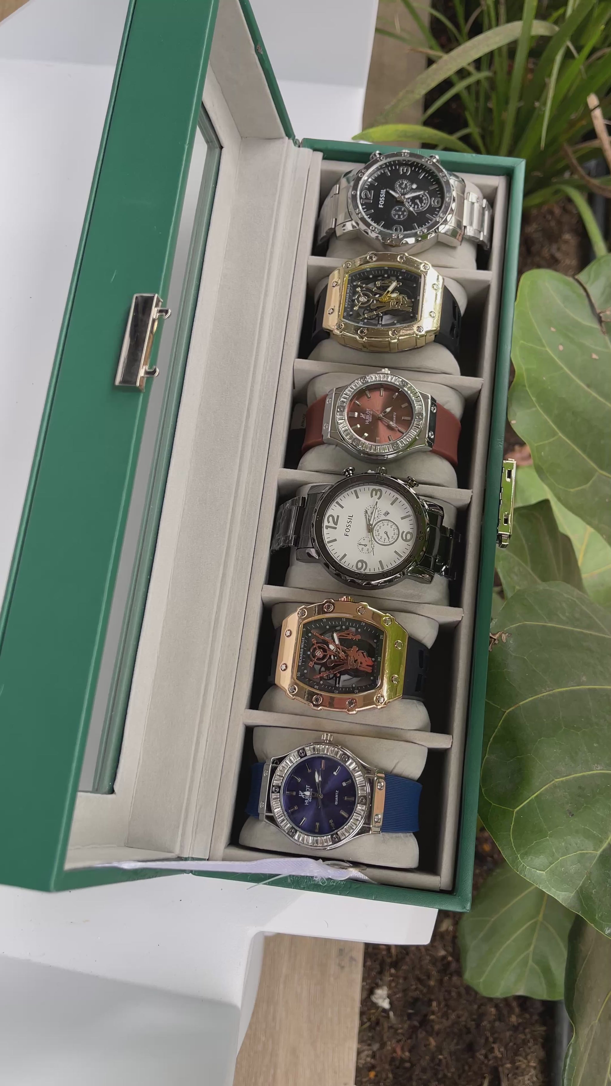 Relojeras se venden a parte (la categoría se llama relojeras y ahí están todas las disponibles para añadir a tu compra según la cantidad de relojes en el combo)