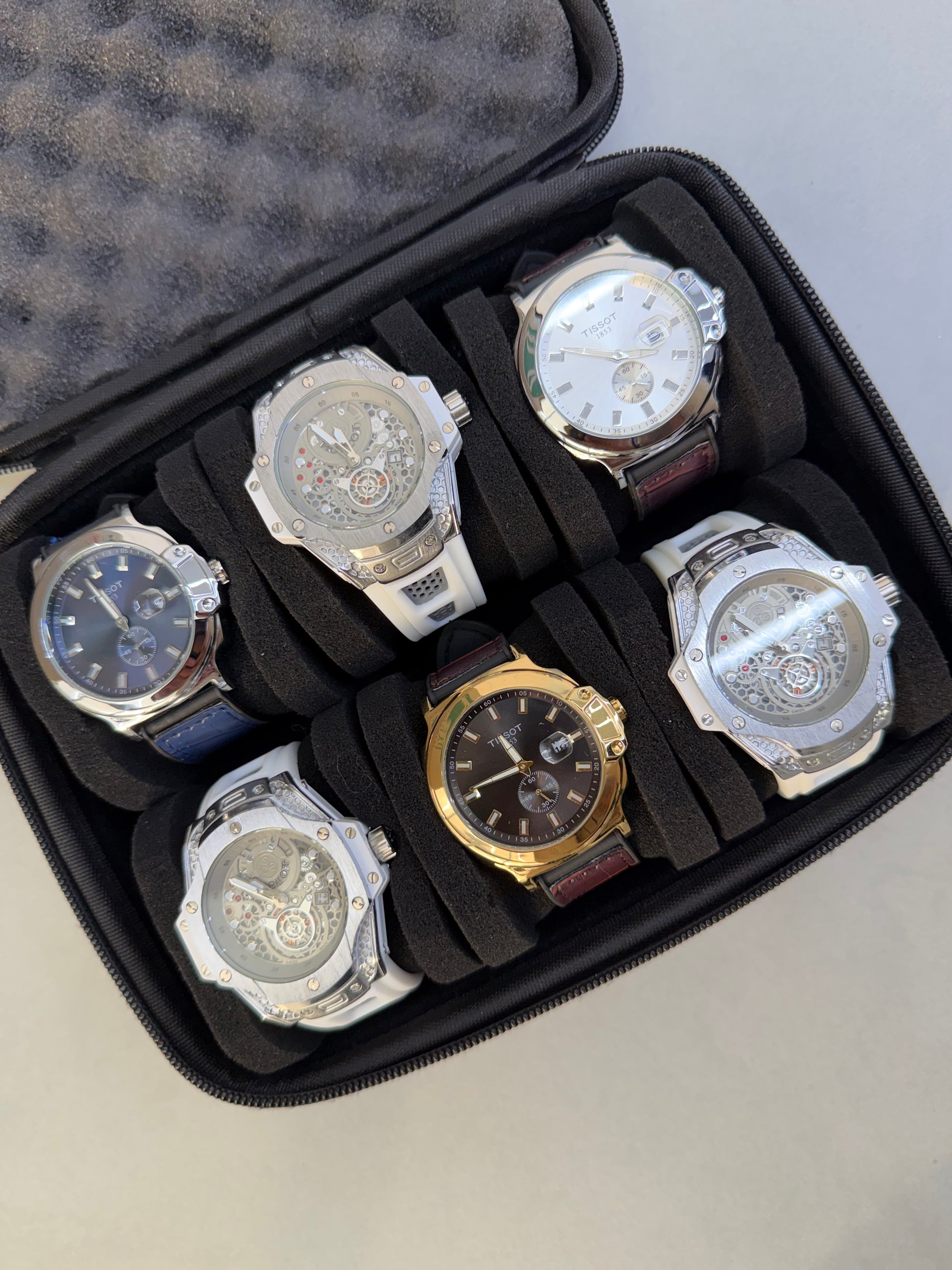 Relojeras se venden a parte (la categoría se llama relojeras y ahí están todas las disponibles para añadir a tu compra según la cantidad de relojes en el combo)