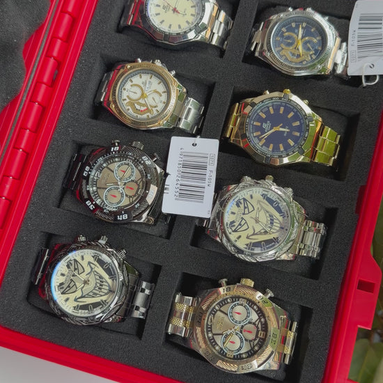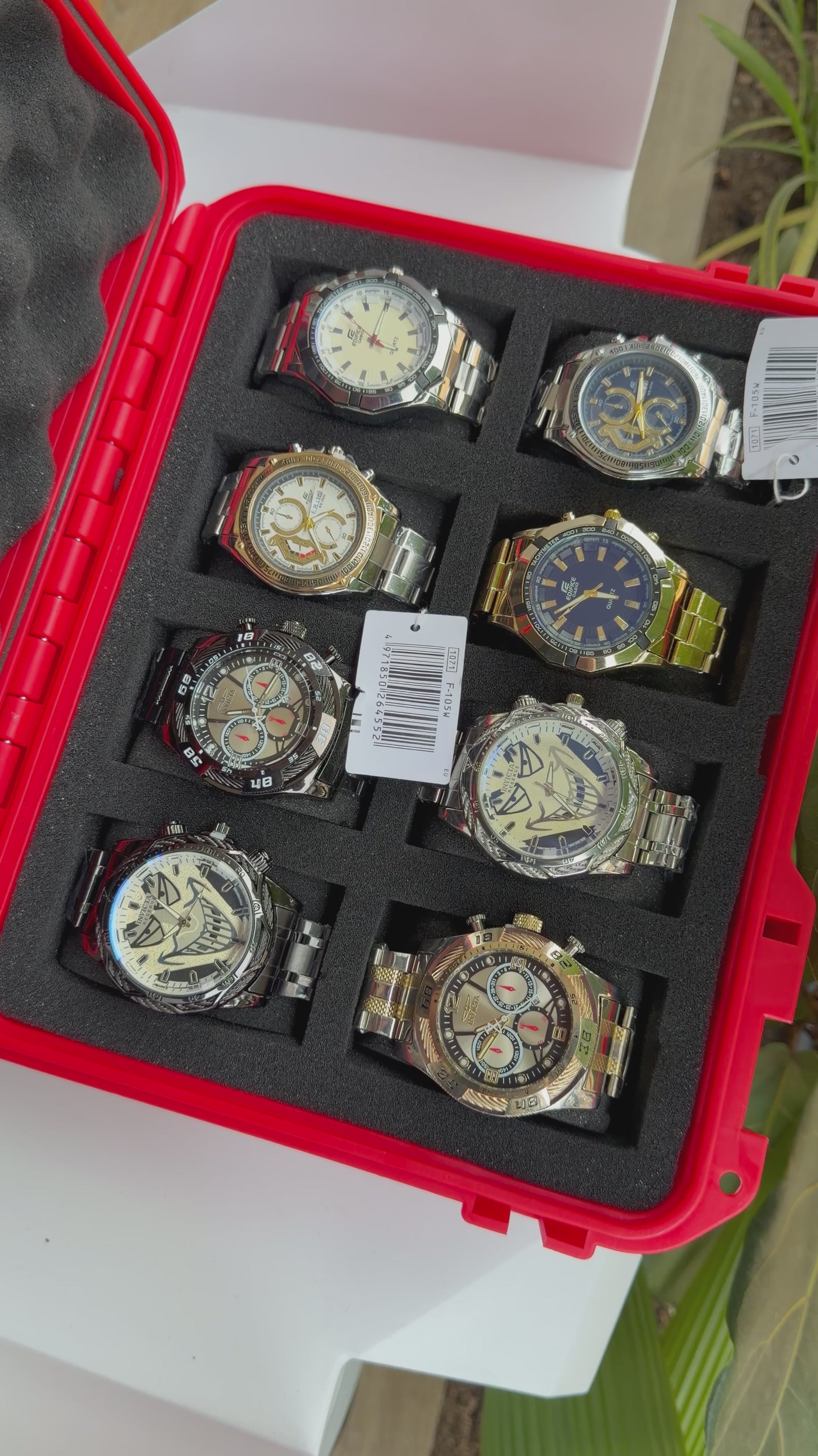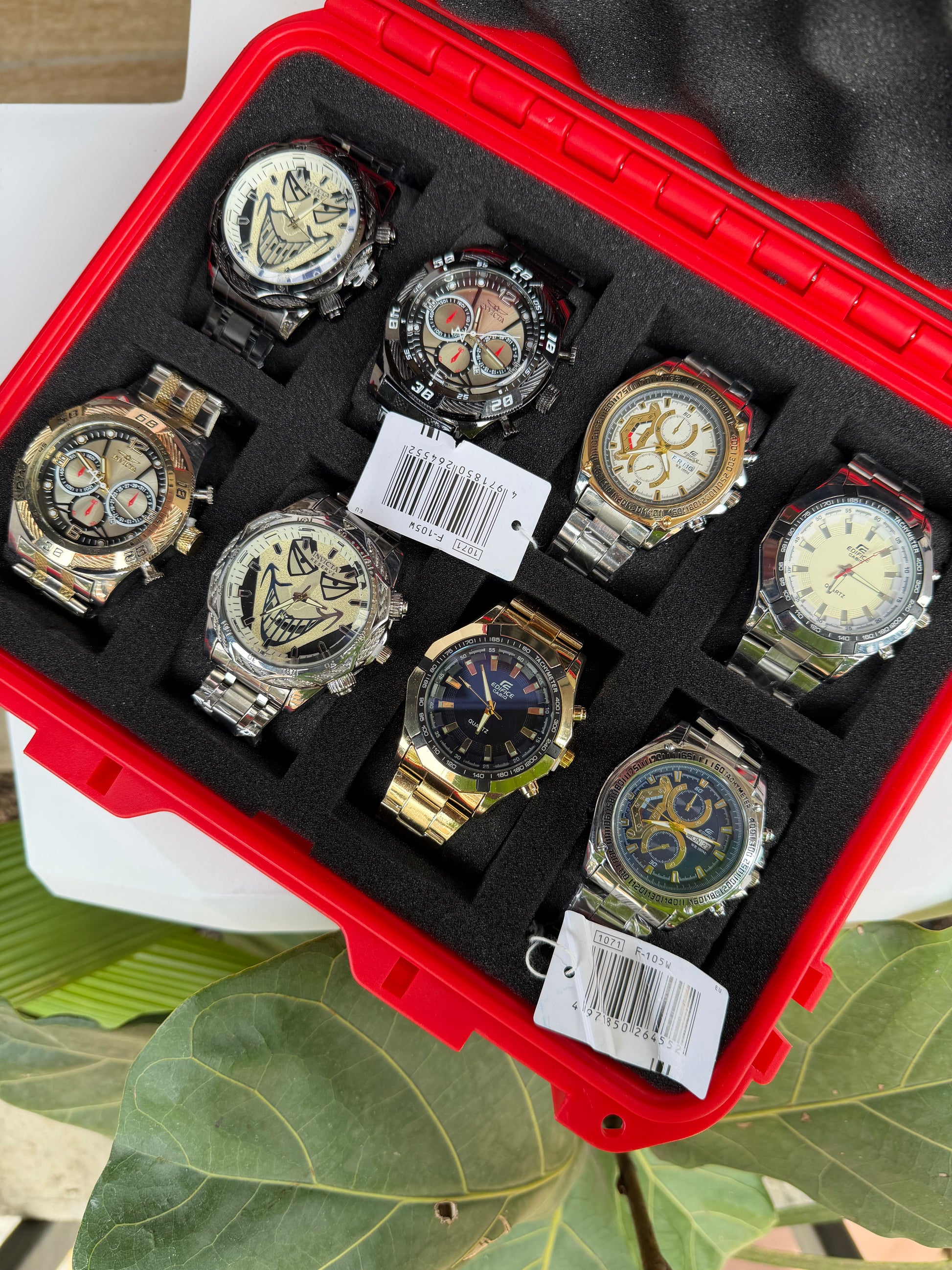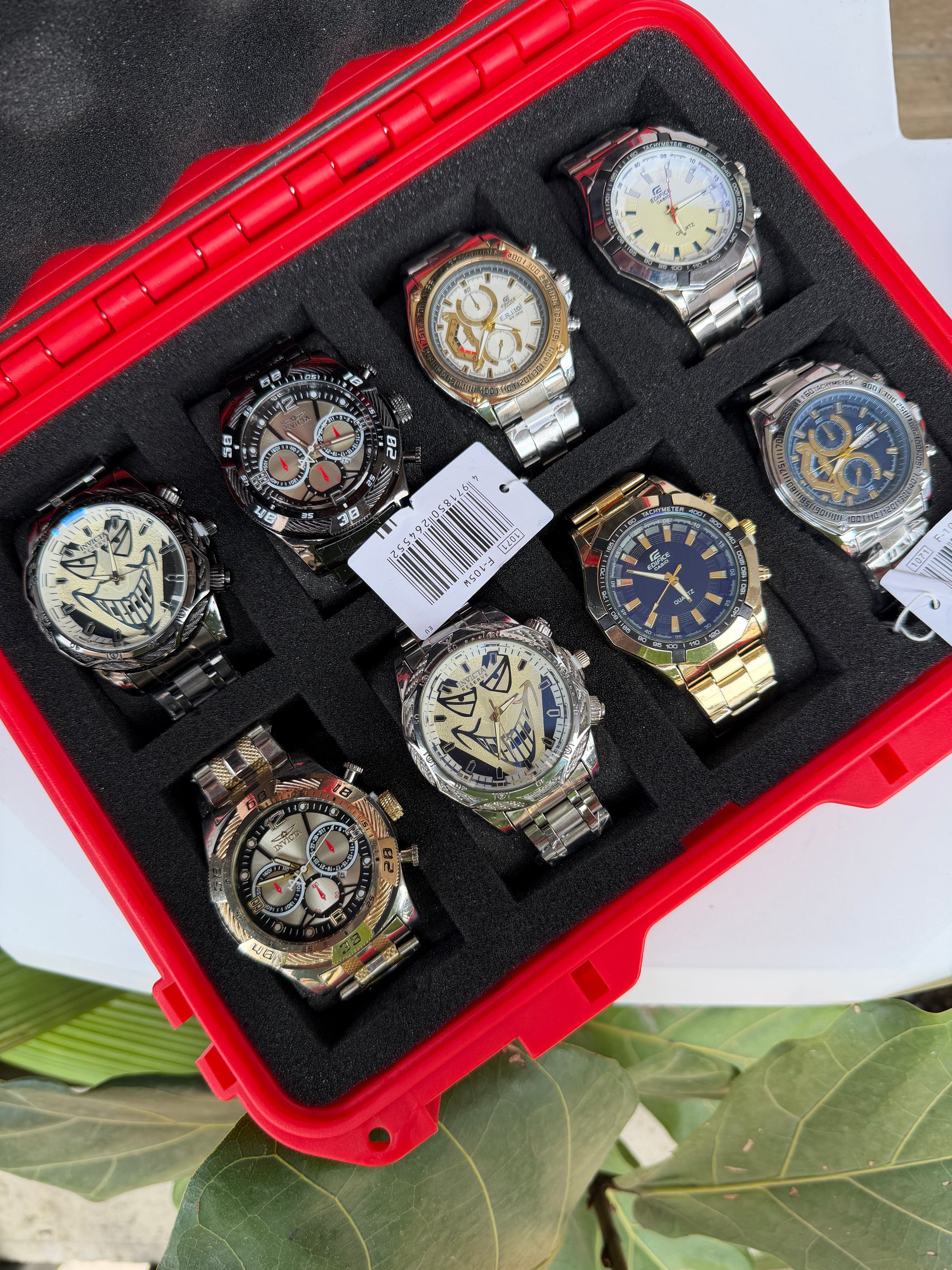Relojeras se venden a parte (la categoría se llama relojeras y ahí están todas las disponibles para añadir a tu compra según la cantidad de relojes en el combo)