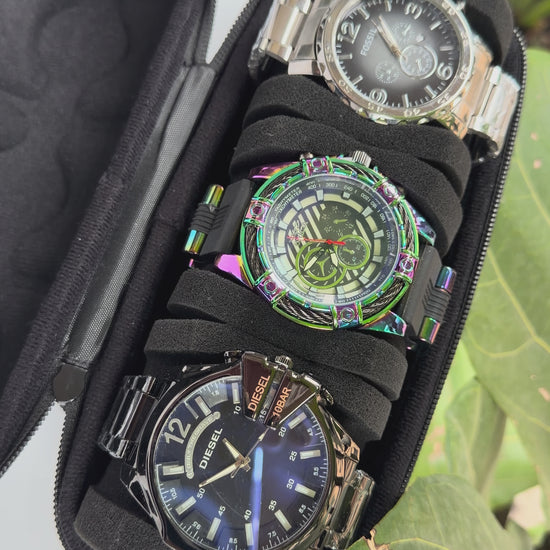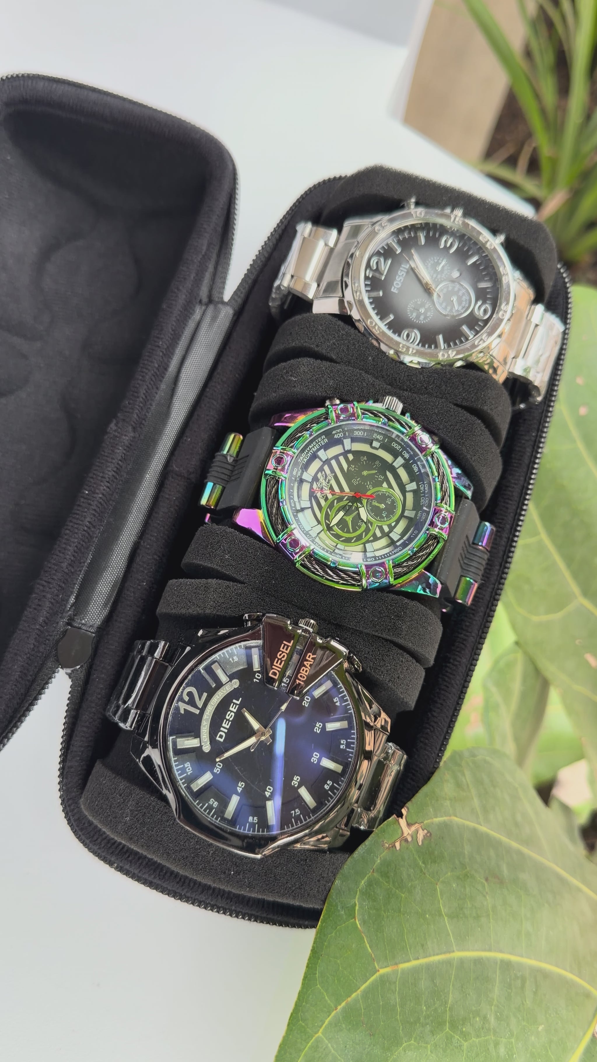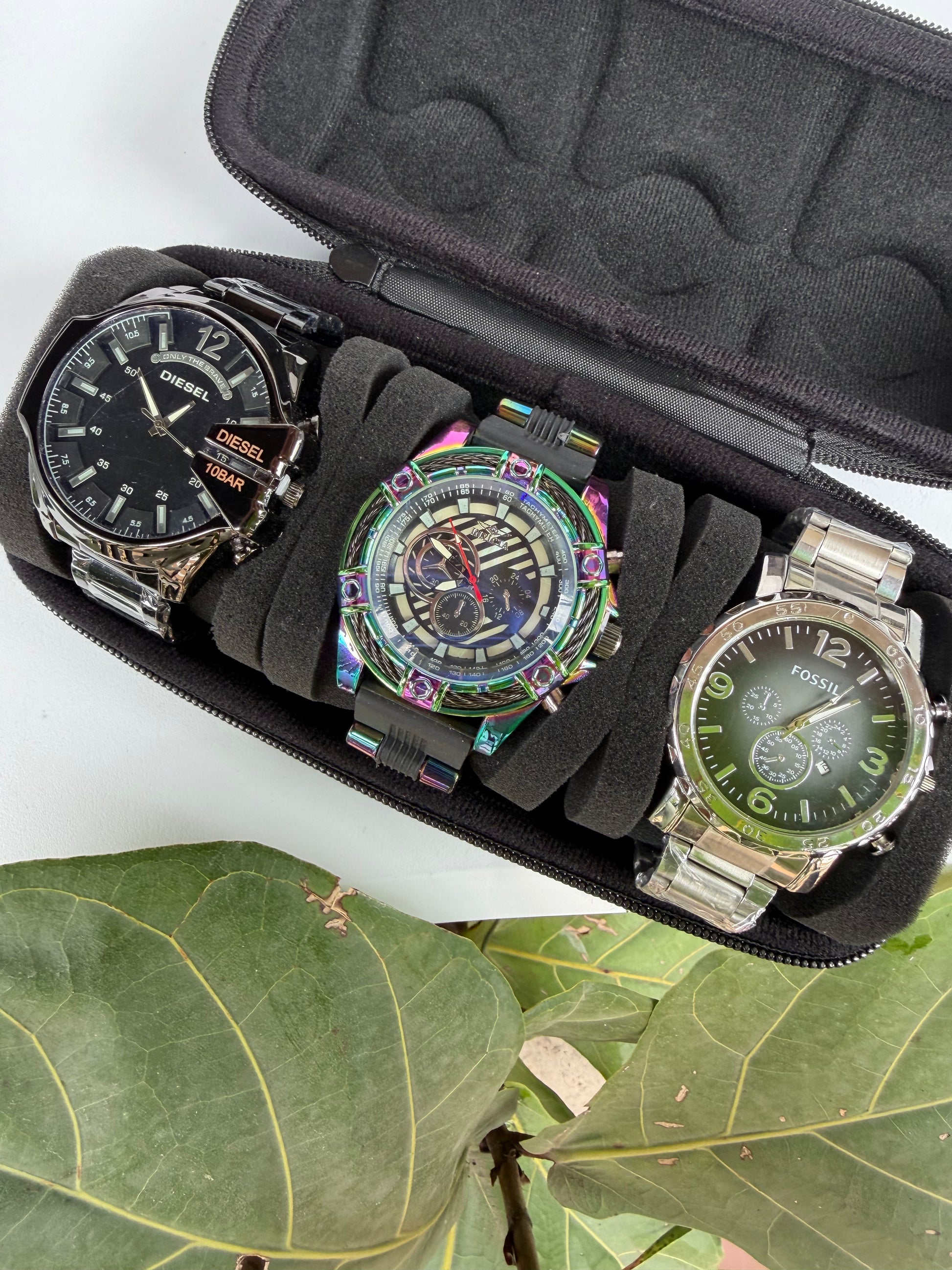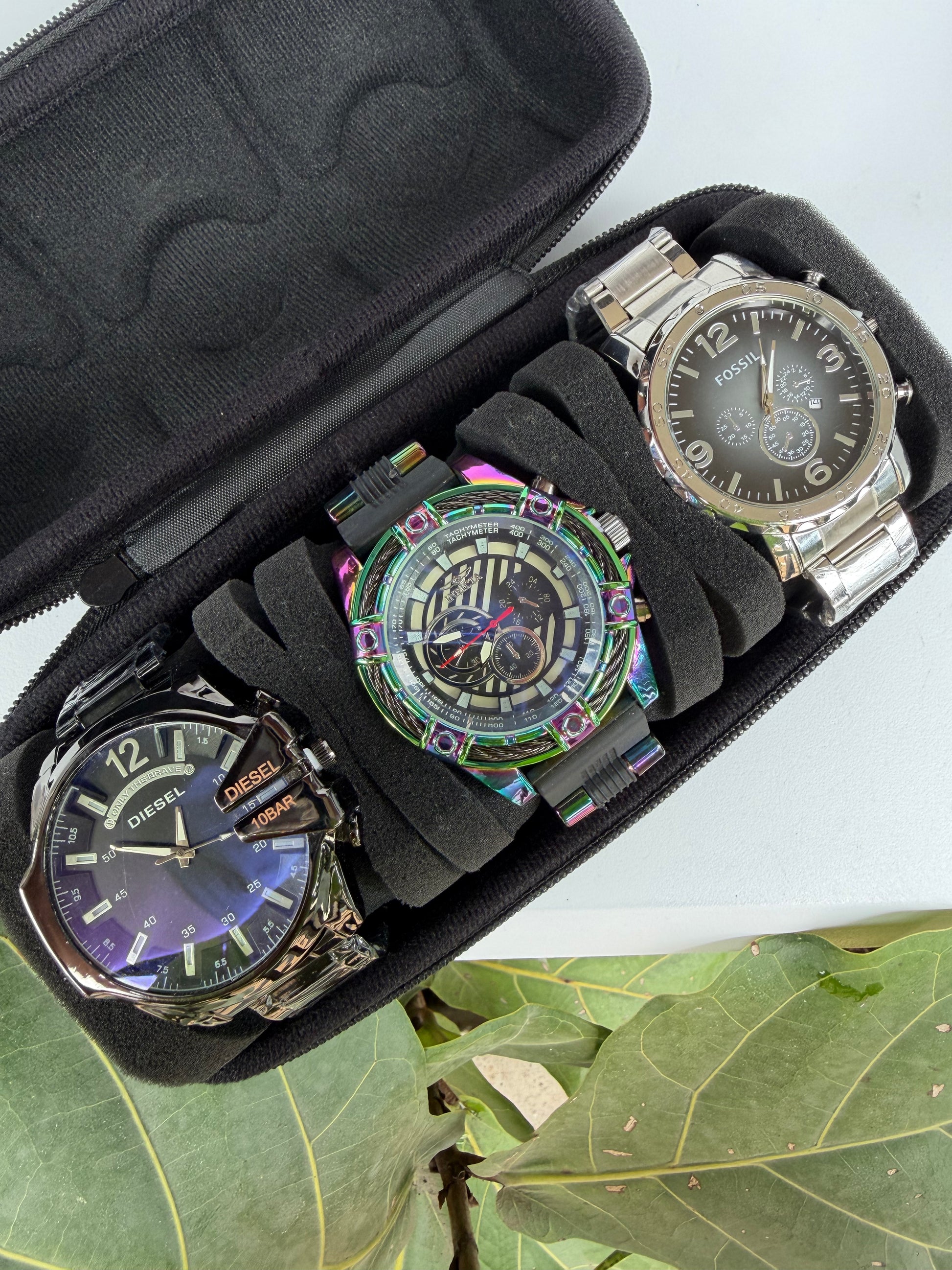 Relojeras se venden a parte (la categoría se llama relojeras y ahí están todas las disponibles para añadir a tu compra según la cantidad de relojes en el combo)