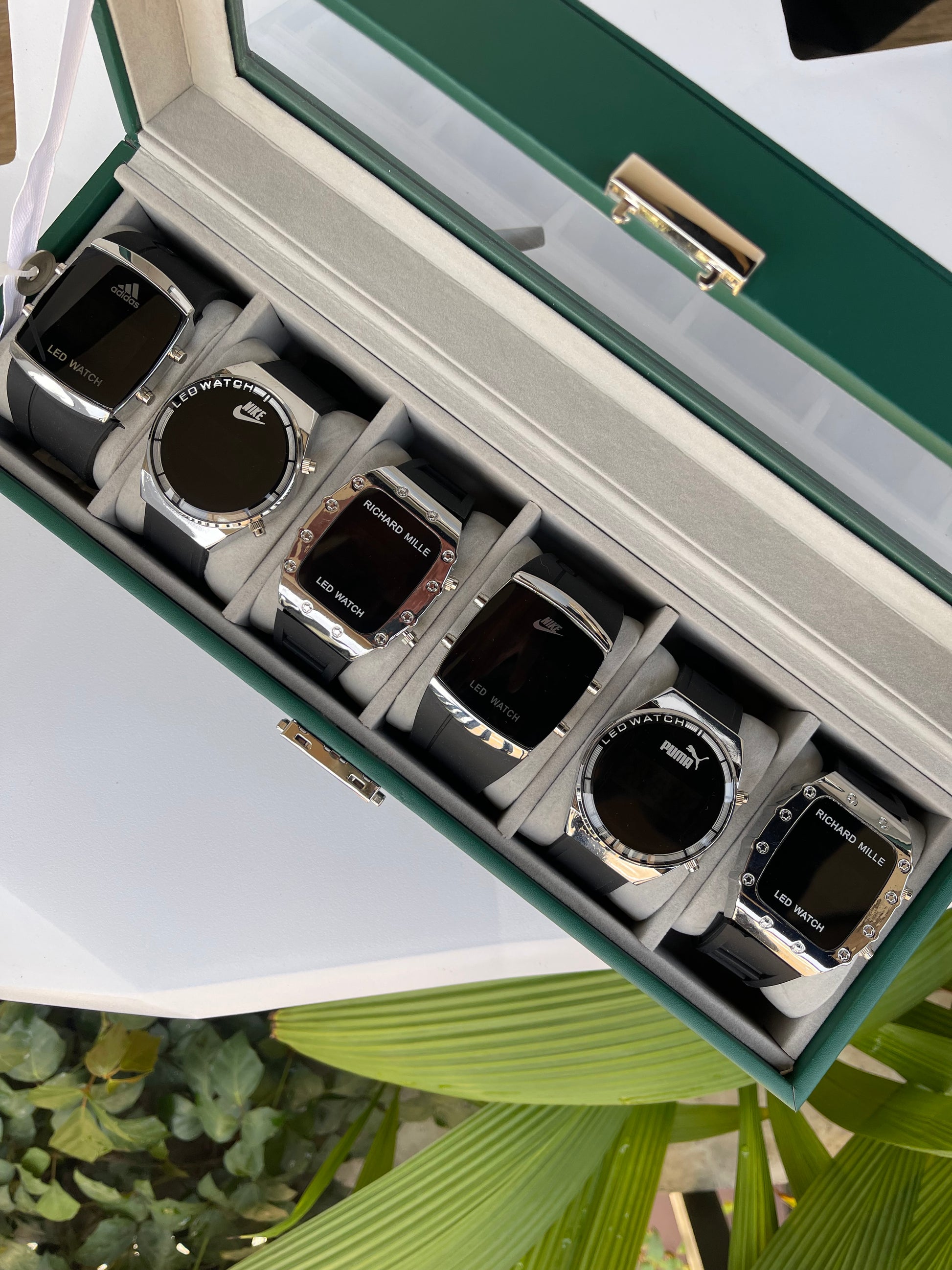 Relojeras se venden a parte (la categoría se llama relojeras y ahí están todas las disponibles para añadir a tu compra según la cantidad de relojes en el combo)
