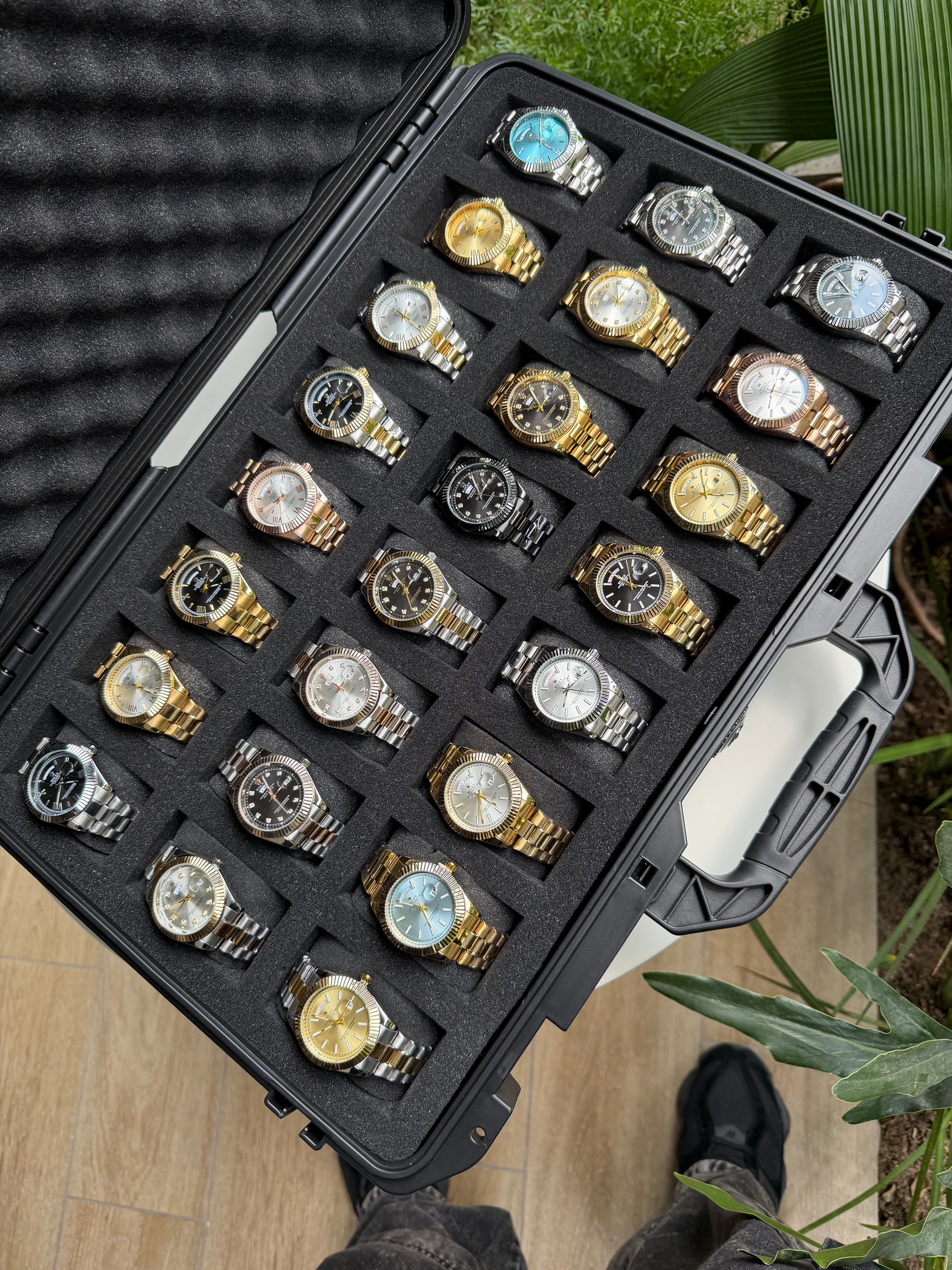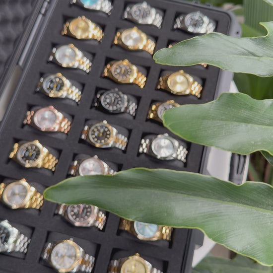 Relojeras se venden a parte (la categoría se llama relojeras y ahí están todas las disponibles para añadir a tu compra según la cantidad de relojes en el combo)