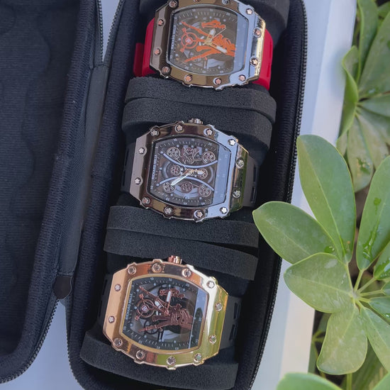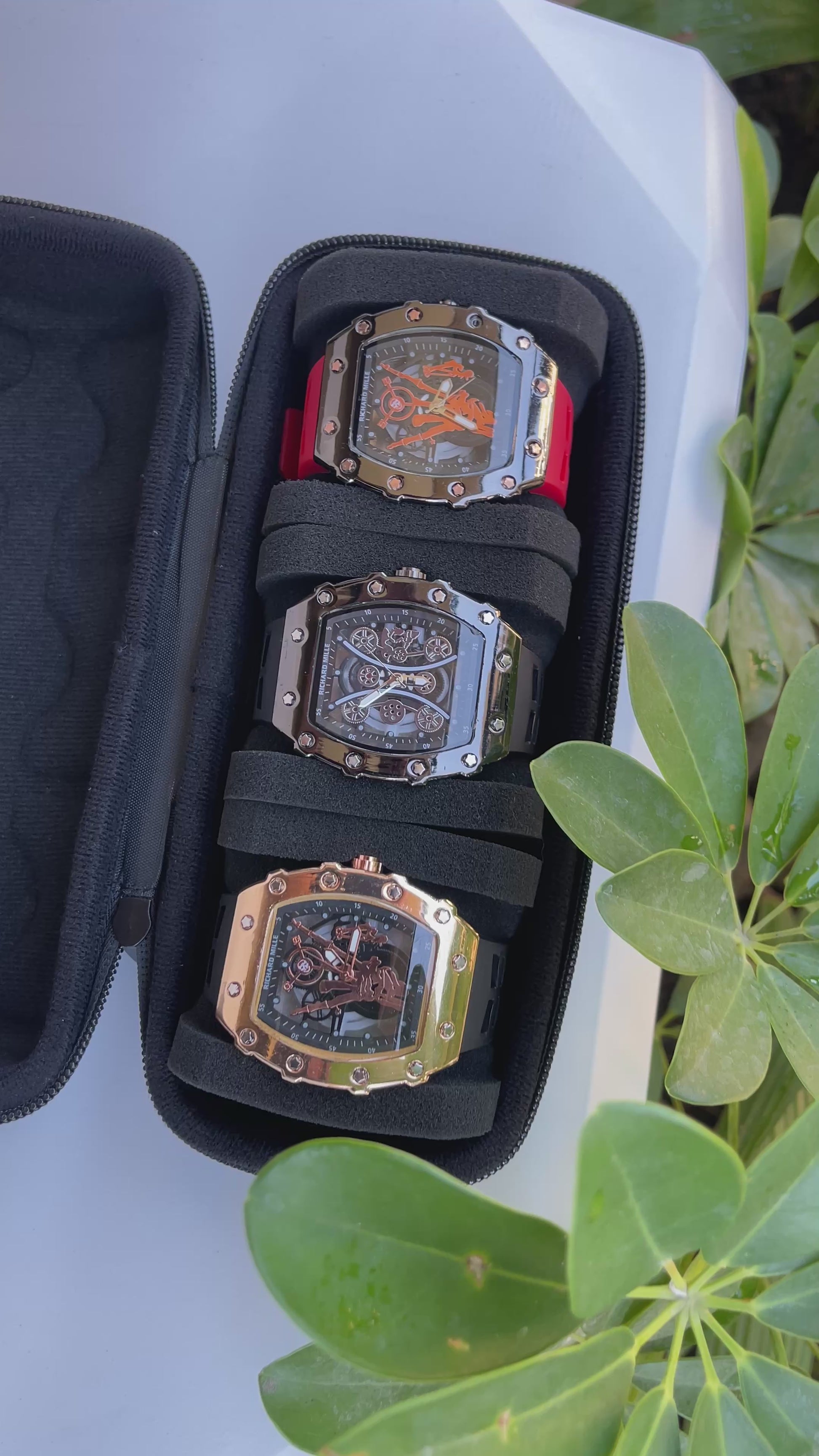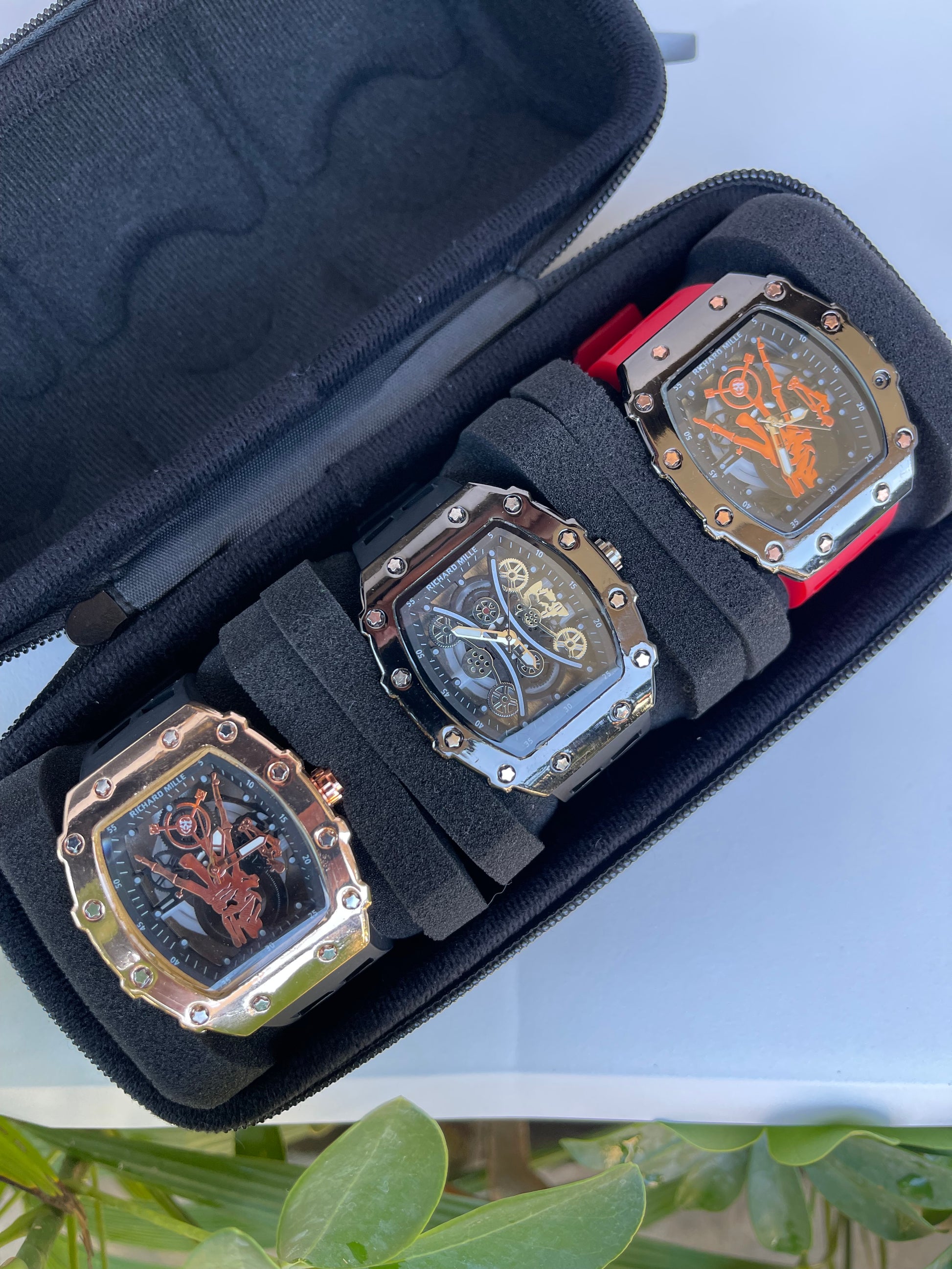 Relojeras se venden a parte (la categoría se llama relojeras y ahí están todas las disponibles para añadir a tu compra según la cantidad de relojes en el combo)