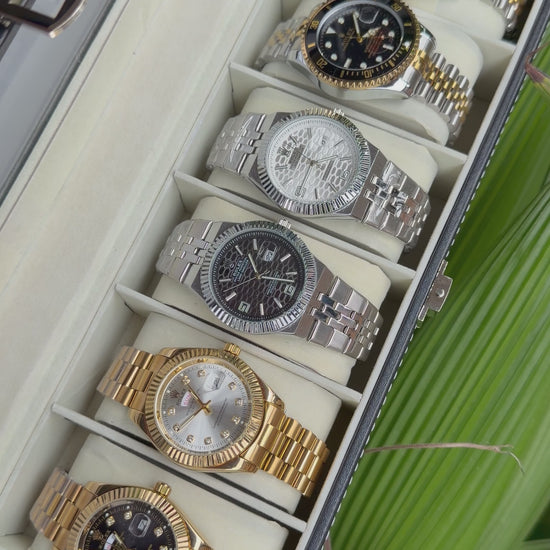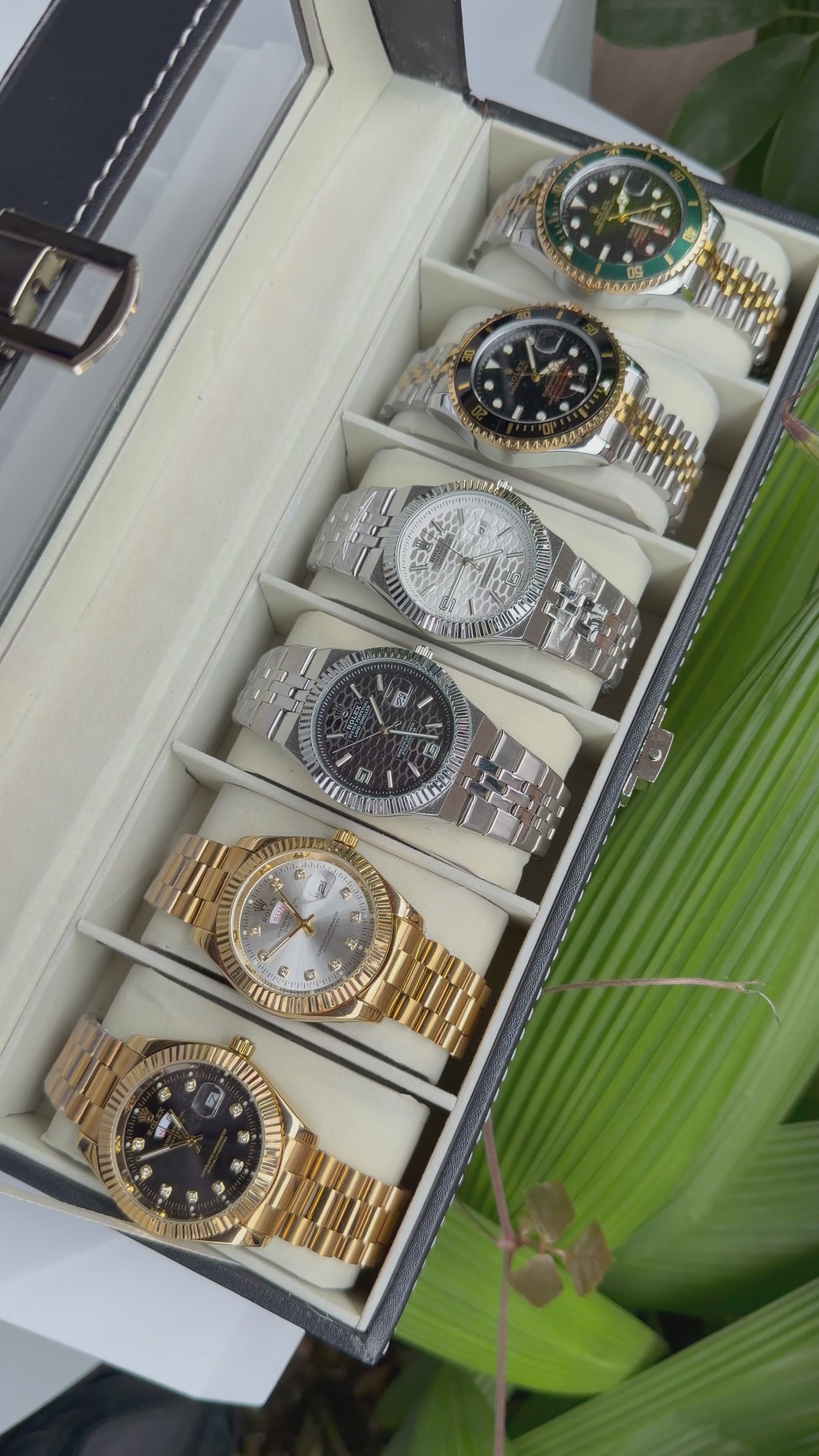 Relojeras se venden a parte (la categoría se llama relojeras y ahí están todas las disponibles para añadir a tu compra según la cantidad de relojes en el combo)
