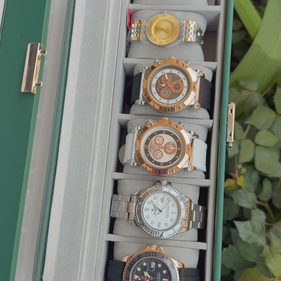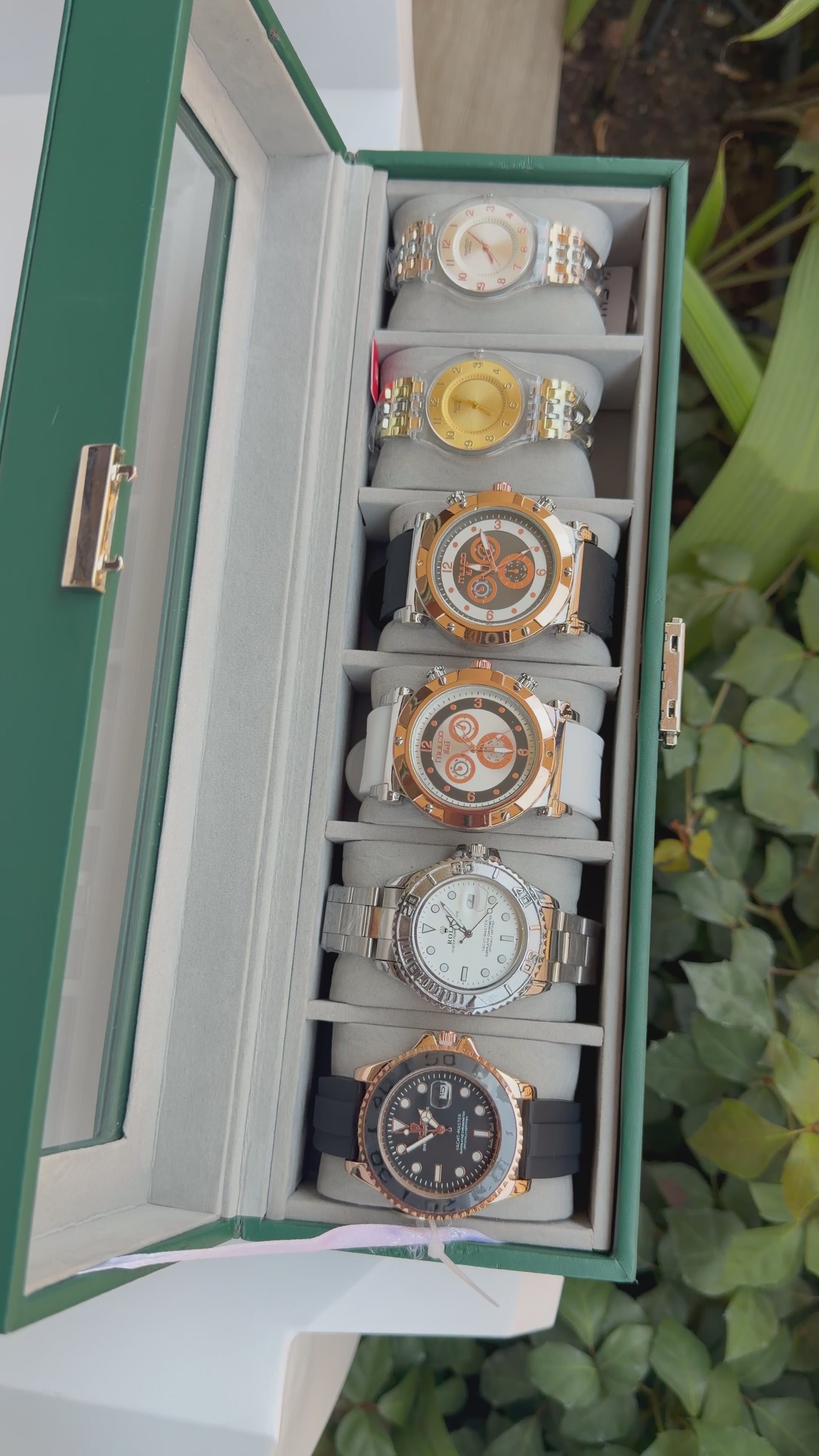 Relojeras se venden a parte (la categoría se llama relojeras y ahí están todas las disponibles para añadir a tu compra según la cantidad de relojes en el combo)