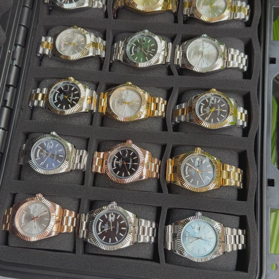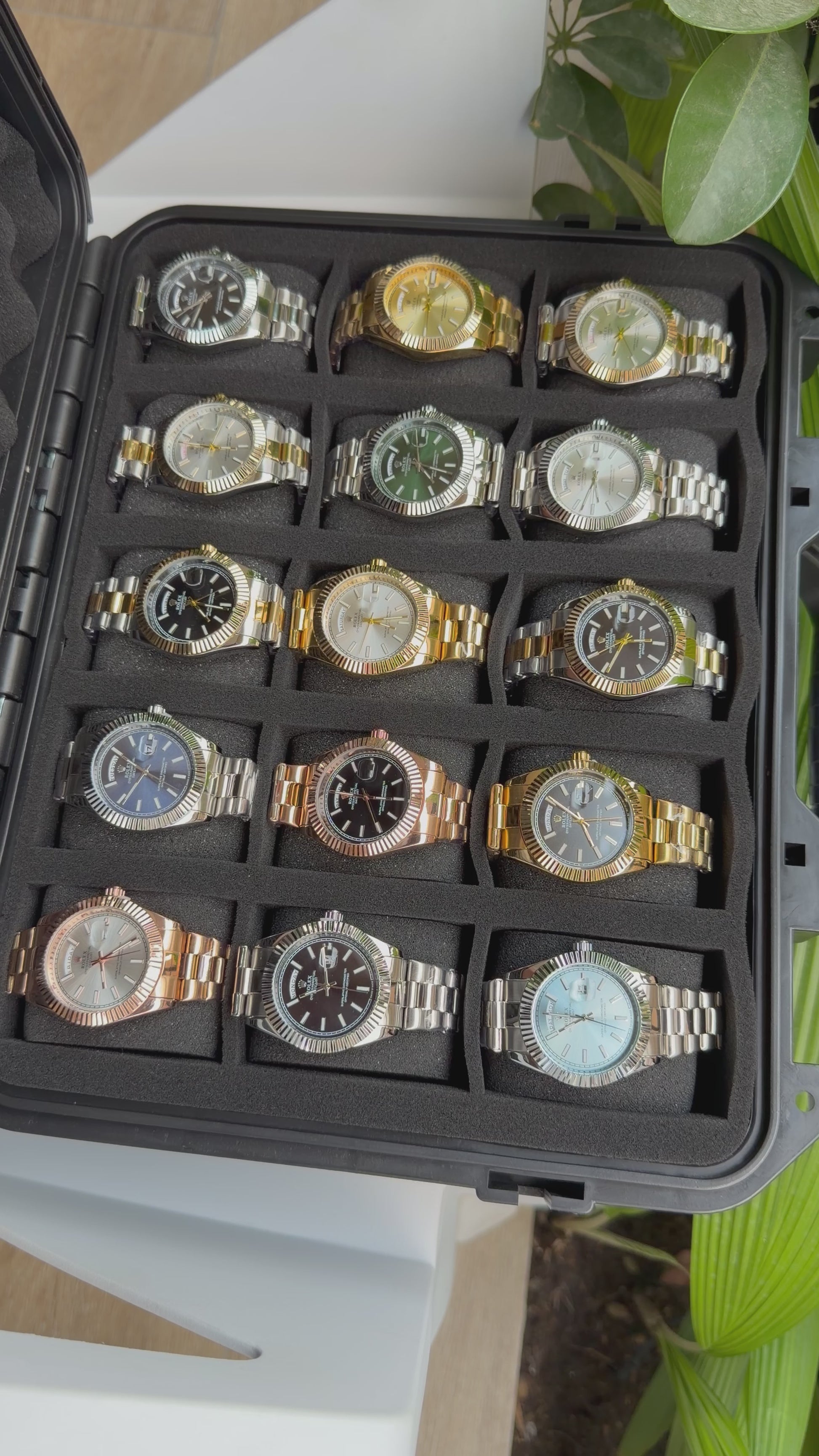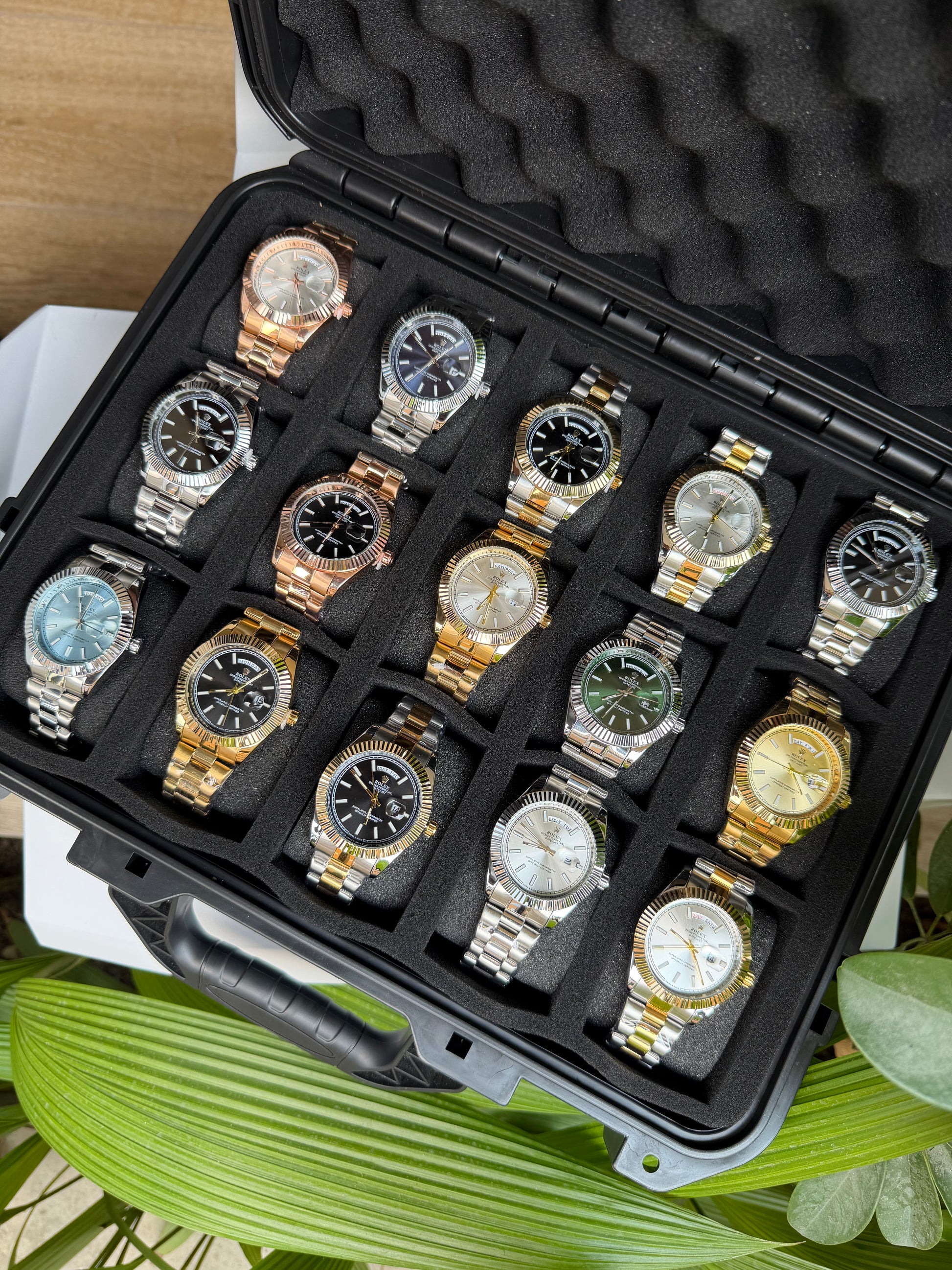 Relojeras se venden a parte (la categoría se llama relojeras y ahí están todas las disponibles para añadir a tu compra según la cantidad de relojes en el combo)