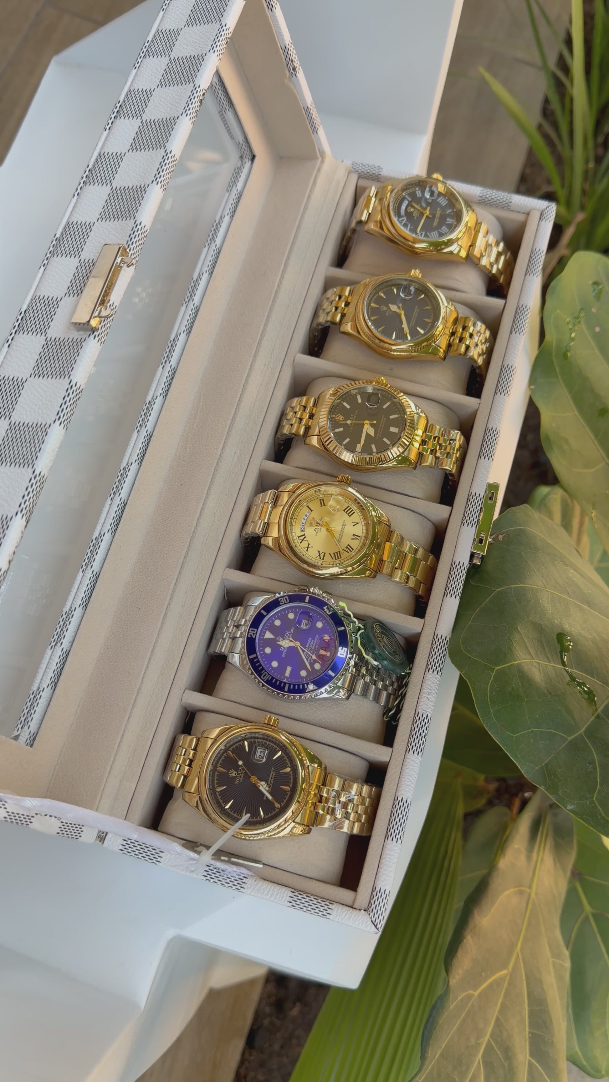 Relojeras se venden a parte (la categoría se llama relojeras y ahí están todas las disponibles para añadir a tu compra según la cantidad de relojes en el combo)
