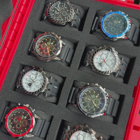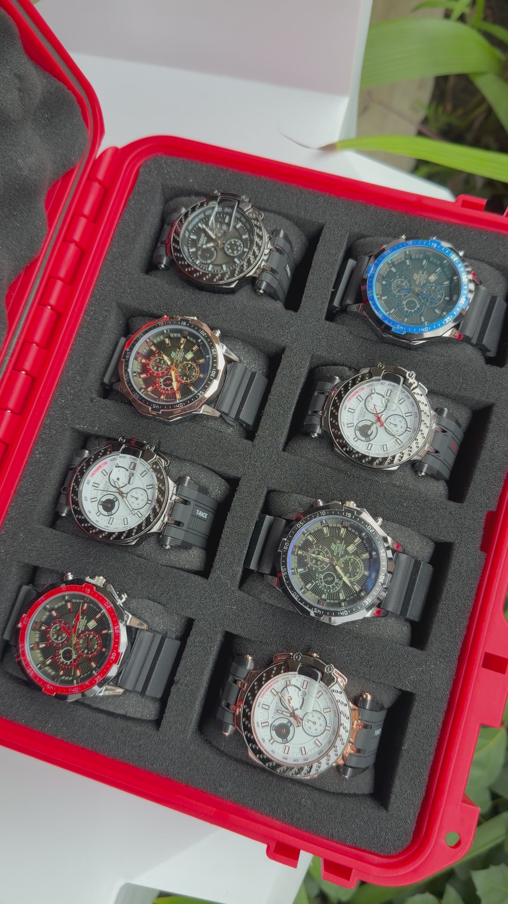 Relojeras se venden a parte (la categoría se llama relojeras y ahí están todas las disponibles para añadir a tu compra según la cantidad de relojes en el combo)