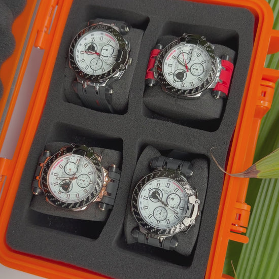 Relojeras se venden a parte (la categoría se llama relojeras y ahí están todas las disponibles para añadir a tu compra según la cantidad de relojes en el combo)