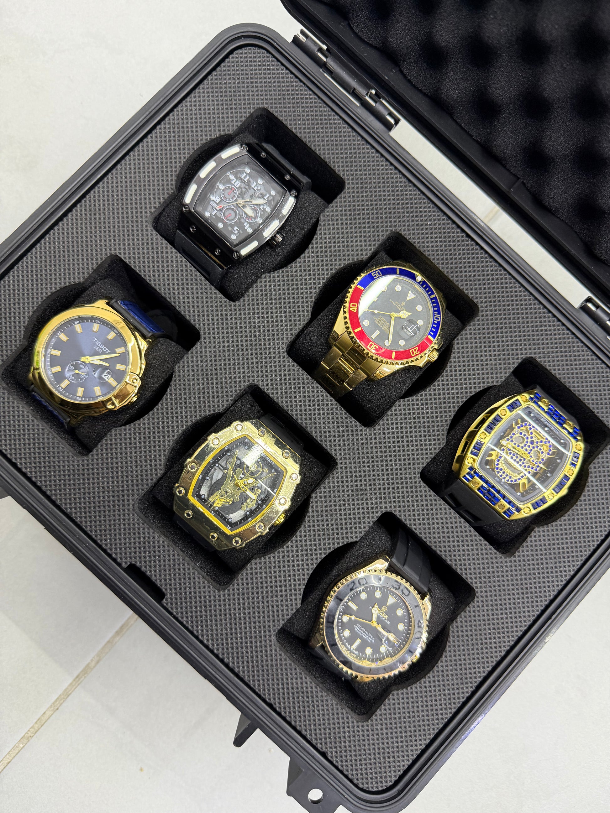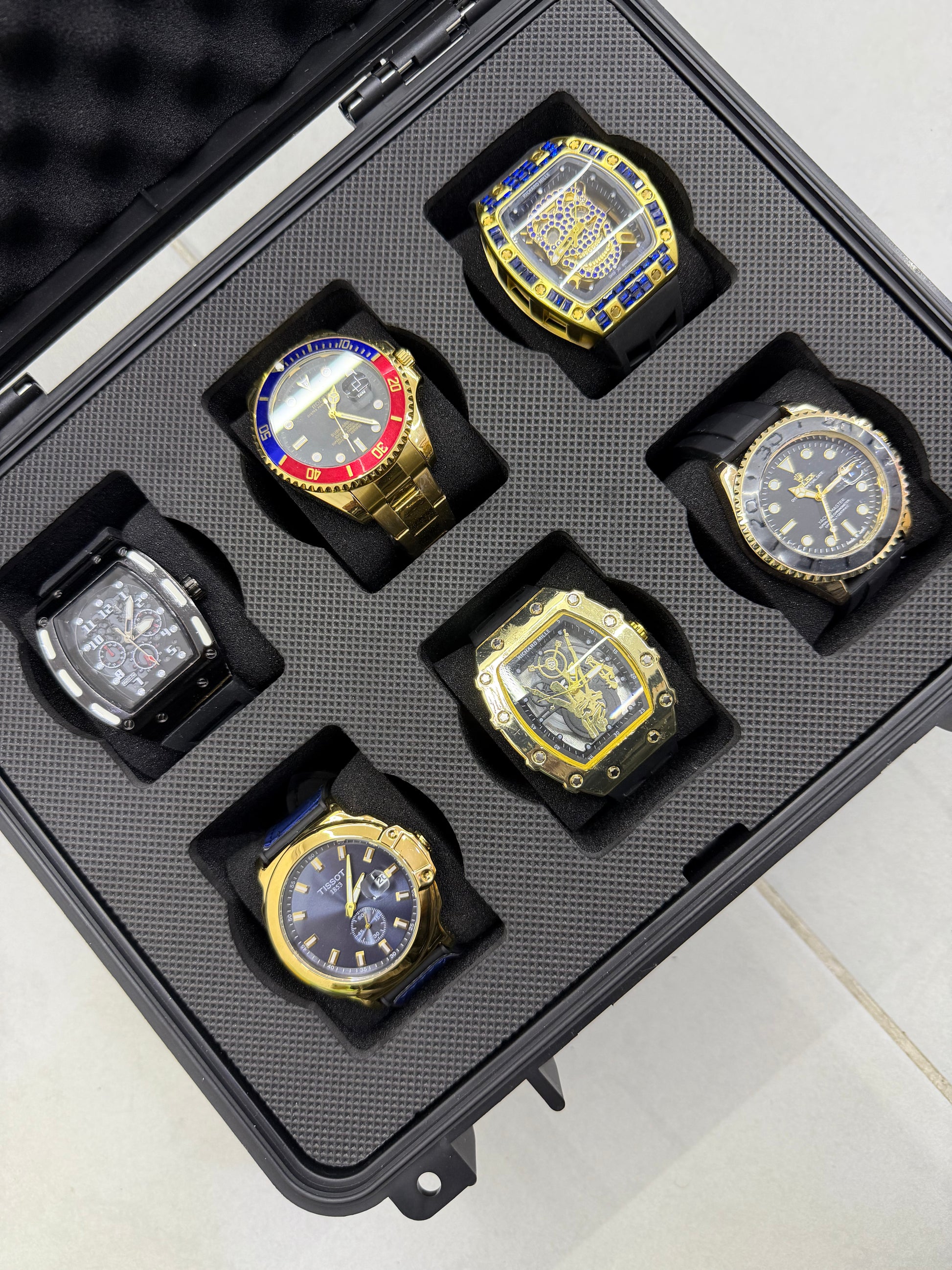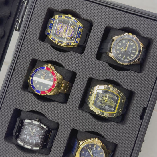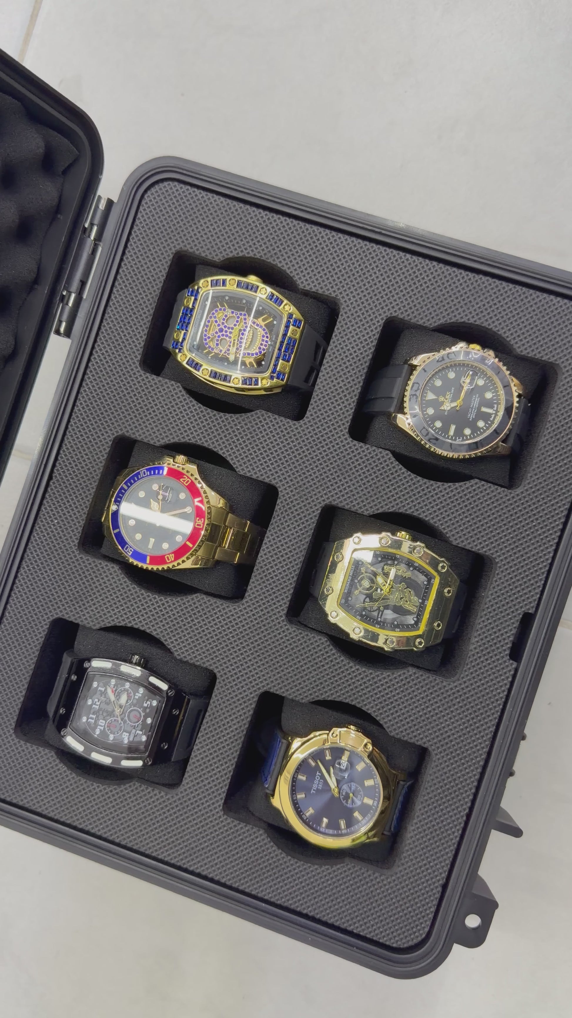 Relojeras se venden a parte (la categoría se llama relojeras y ahí están todas las disponibles para añadir a tu compra según la cantidad de relojes en el combo)